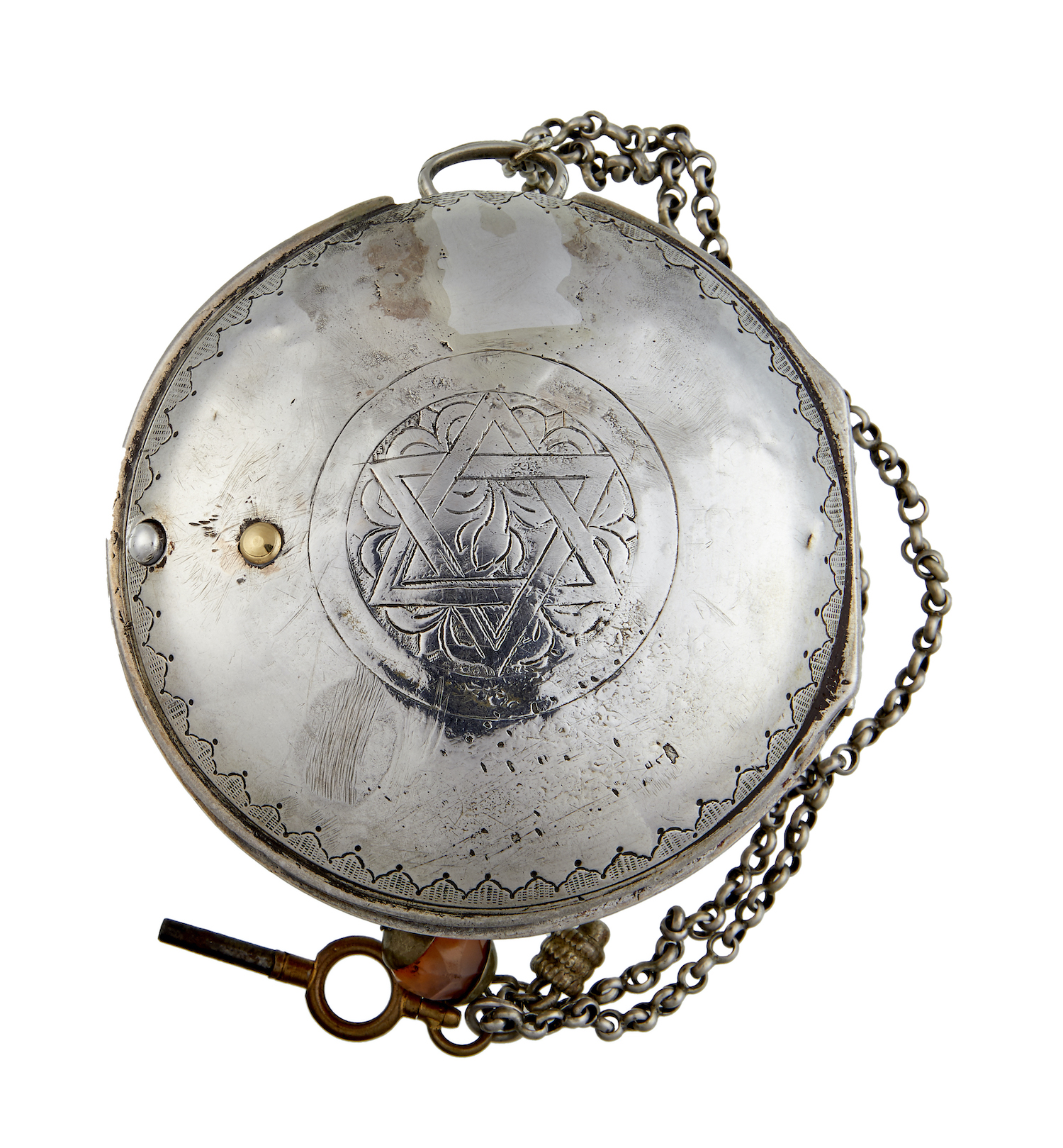 Brass full plate verge movement, chain fusee, pierced and engraved balance cock, pierced hybrid pillars, silvered regulator movement signed 'Geo Prior, London' and numbered 34748. The plain silver inner case hallmarked London 1808 Richard James. The white enamel dial with black Turkish hour markers, black outer minute divisions with Turkish five minute markers, blued steel beetle and poker hands. Dial signed 'George Prior, London'. A plain silver hinged case, silver and tortoiseshell outer case with stud decoration with a heavily engraved outer case decorated with traditional middle eastern designs, silver fob chain and key.