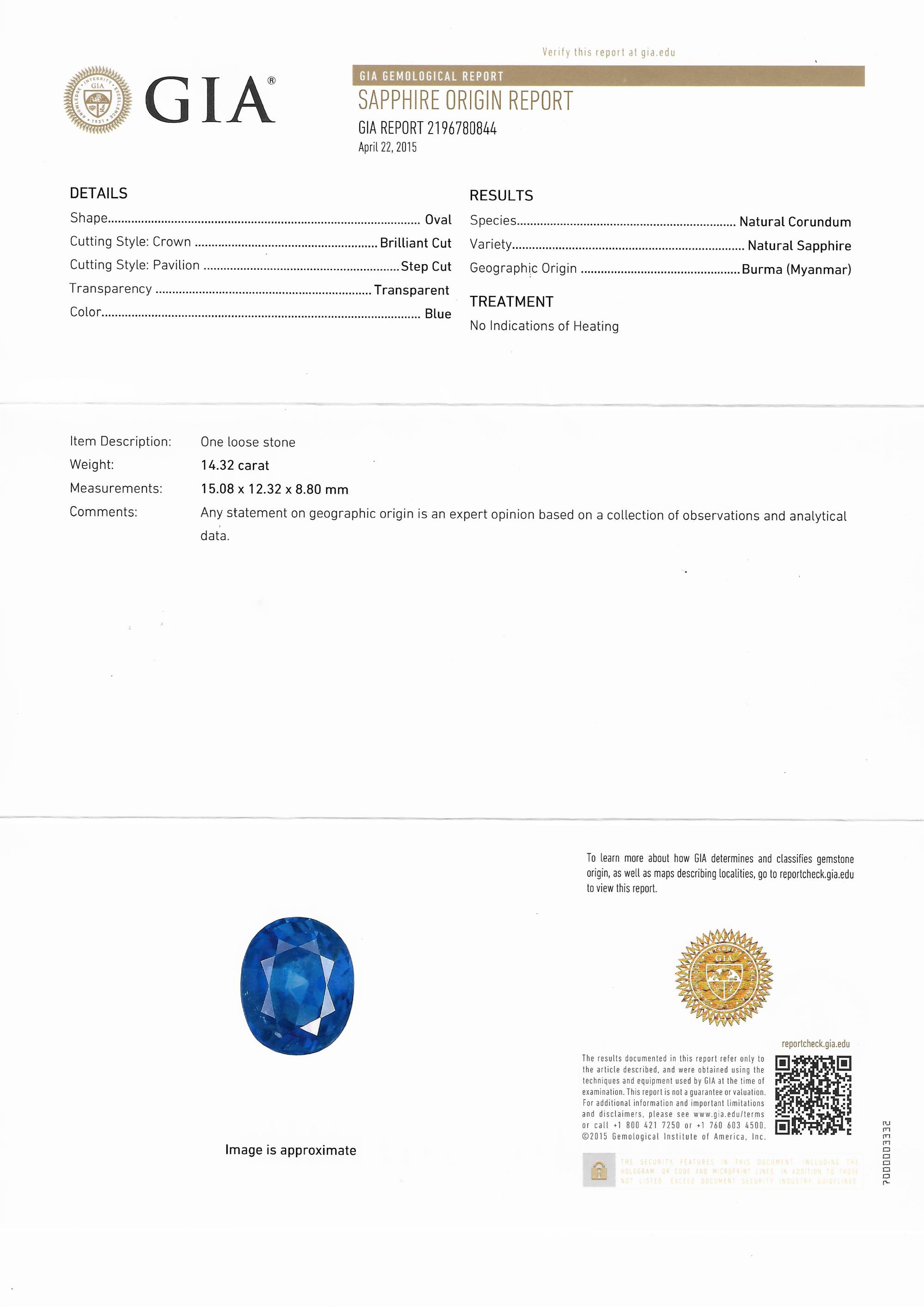 Accompanied by a GIA report numbered 2196780844, dated 22 April 2015, stating that the 14.32 carat sapphire is natural, with no indications of heating, of Burmese (Myanmar) origin.
