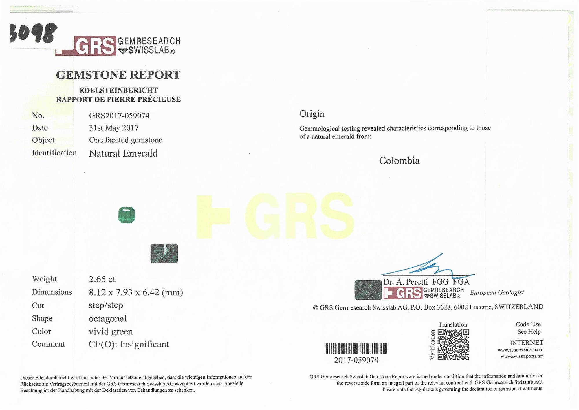 Accompanied by a GRS report numbered GRS2017-059074, dated 31 May 2017, stating that the 2.65 carat emerald is natural, of Colombian origin.