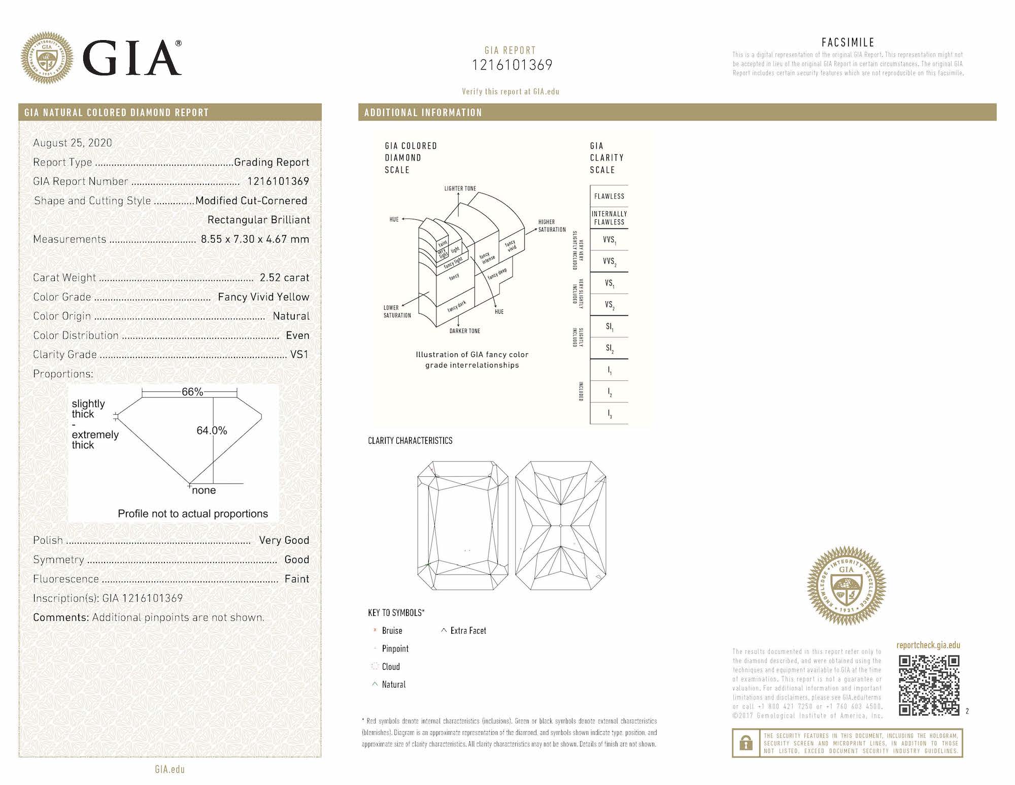 a GIA report numbered 1216101369, dated 25 August 2020, stating that 2.52 carat diamond is natural, fancy vivid yellow colour, VS1 clarity, laser inscribed;