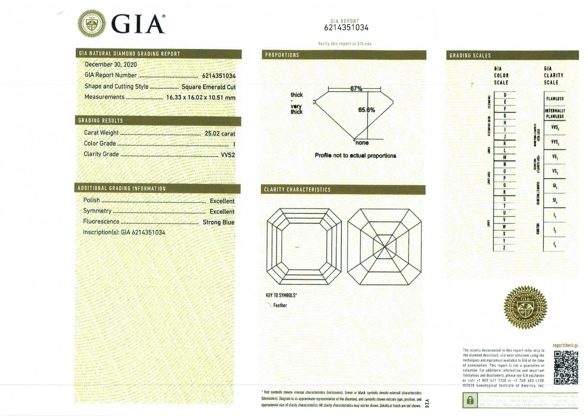 Accompanied by a GIA report numbered 6214351034, dated 30 December 2020, stating that the 25.02 carat diamond is I colour, VVS2 clarity, laser inscribed.