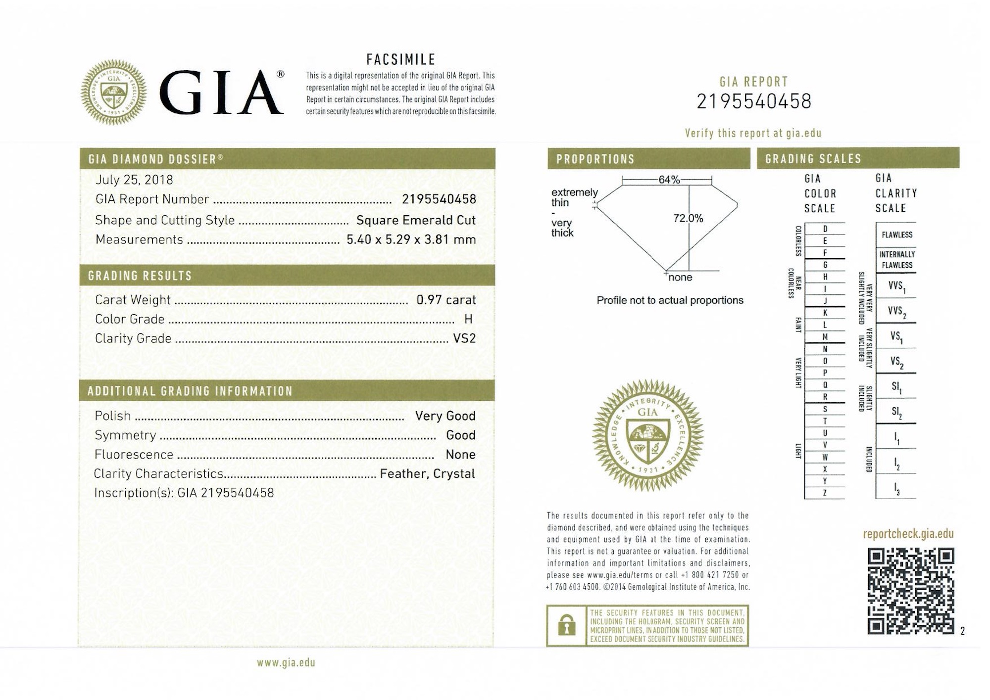 a GIA report numbered 2195540458, dated 25 July 2018, stating that the 0.97 carat diamond is natural, H colour, VS2 clarity, laser inscribed;