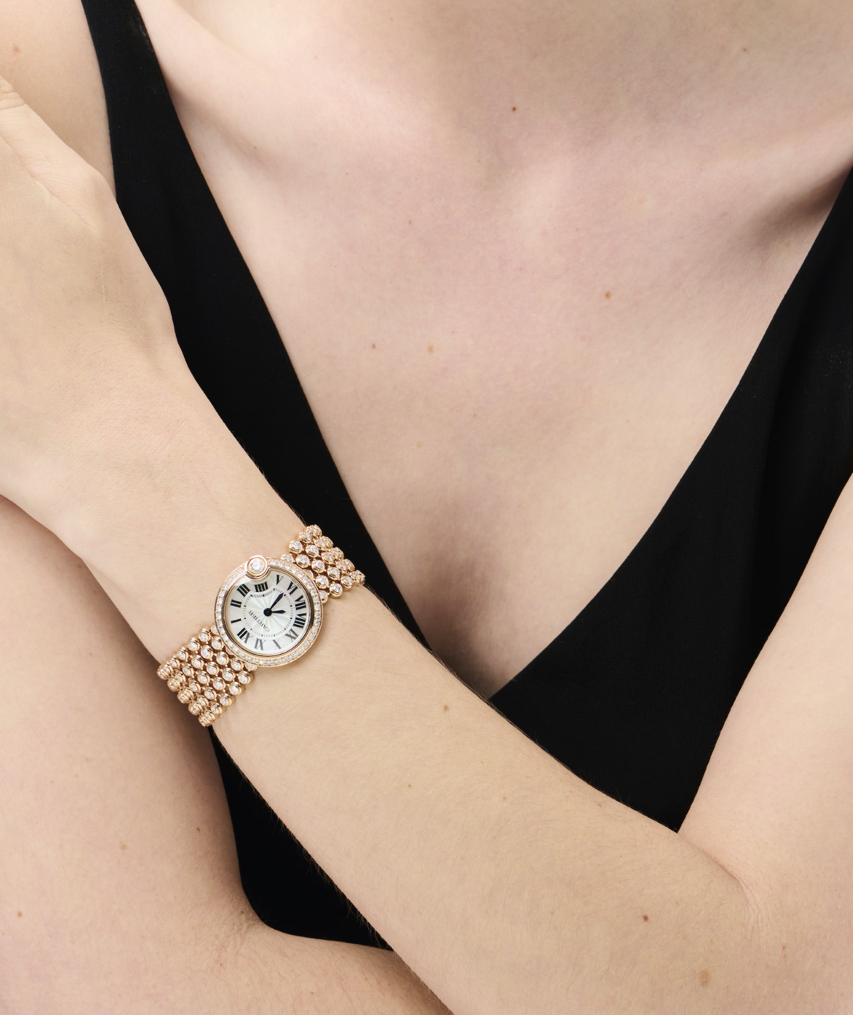 CARTIER REF. 3722, A MAGNIFICENT, LAVISH AND EXCEPTIONALLY RARE 18CT ROSE GOLD WITH BRILLIANT-CUT DIAMOND-SET BRACELET BALLON BLANC LADY'S WATCH WITH MOTHER-OF-PEARL FLINQUÉ DIAL