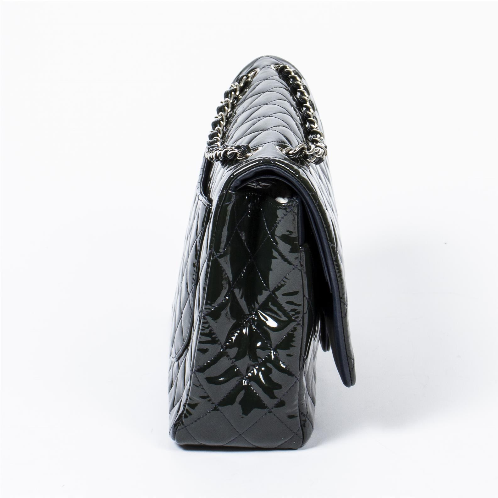 Styled in forest green quilted paten leather with interlaced chain strap and silver tone metal hardware, 34 x 23 x 10cm.