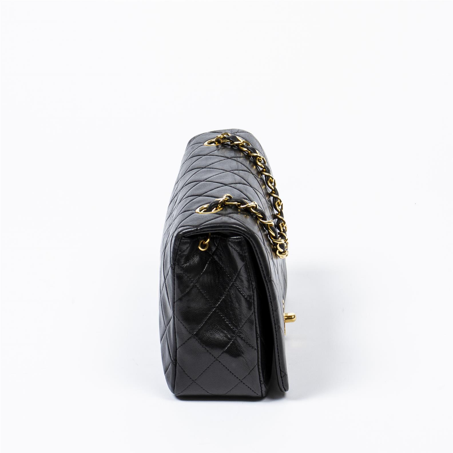 Styled in black quilted leather with in interlaced chain strap and gold tone hardware, 23 x 14 x 7cm.