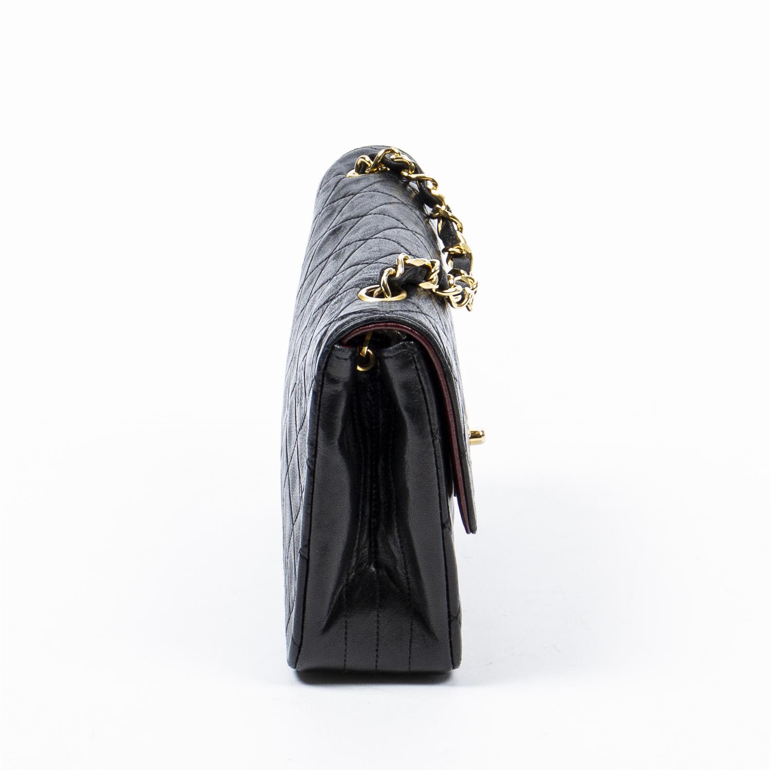 Styled in black quilted leather with interlaced chain strap and gold tone hardware, 19 x 13 x 5.5cm.