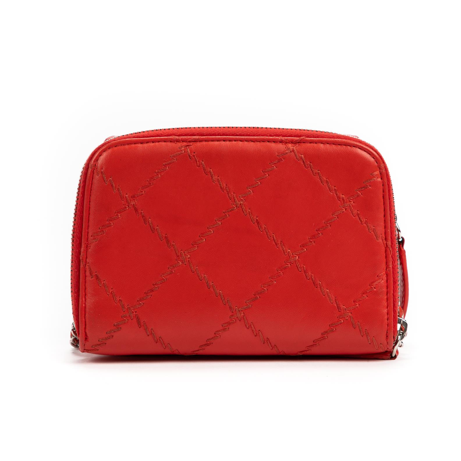 Styled in red quilted leather with interlaced chain shoulder strap and silver tone metal hardware, 16 x 13 x 6cm.
