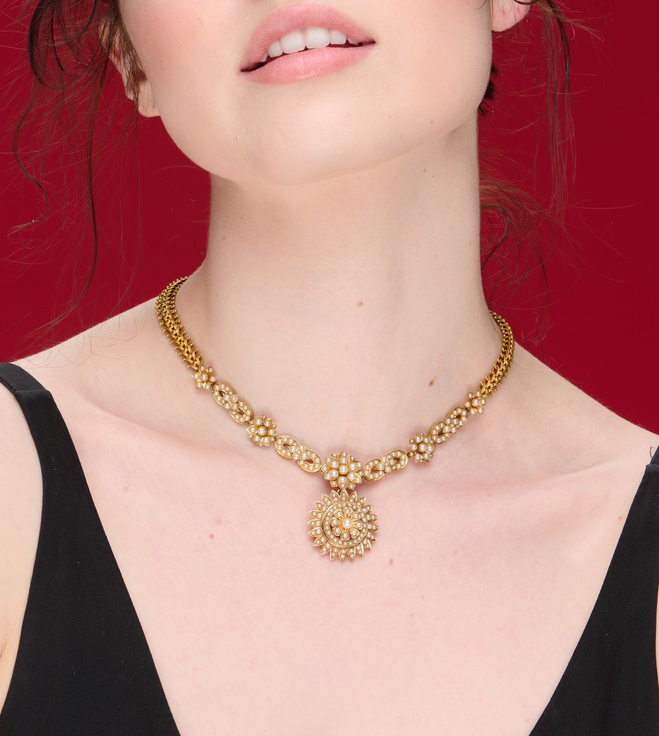 The front designed as a chain of flowerheads set throughout with seed pearls to a fancy beaded mesh necklace, suspending a detachable similarly-set flowerhead motif pendant/brooch, length 400mm, pendant diameter 27mm, accompanied by a fitted case and the brooch fitting.