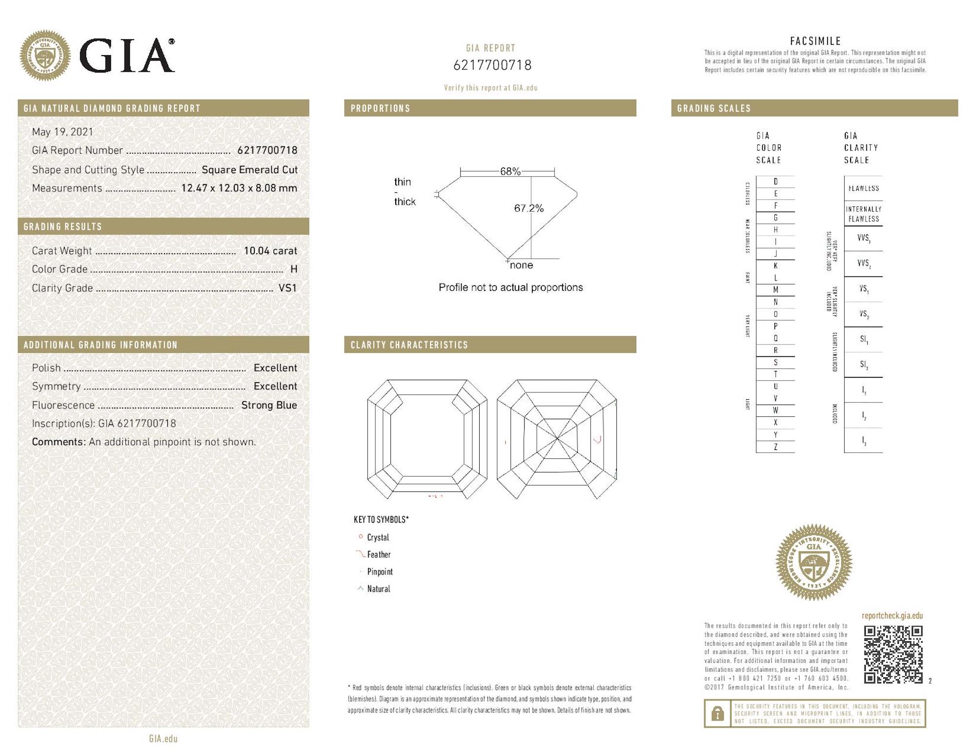 Accompanied by a GIA report numbered 6217700718, dated 19 May 2021, stating that the 10.04 carat diamond is natural, H colour, VS1 clarity, laser inscribed.