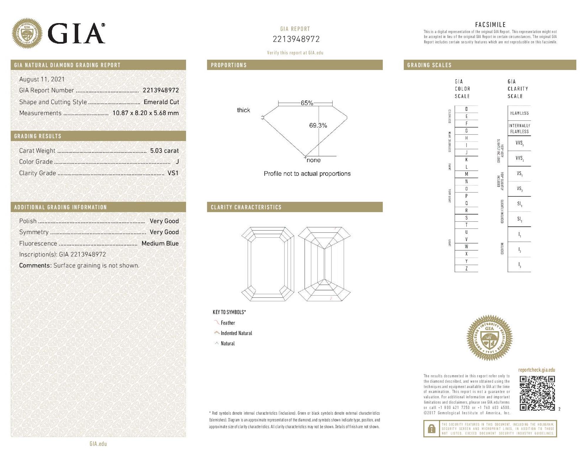 Accompanied by a GIA report numbered 2213948972, dated 11 August 2021, stating that the 5.03 carat diamond is J colour, VS1 clarity, laser inscribed.