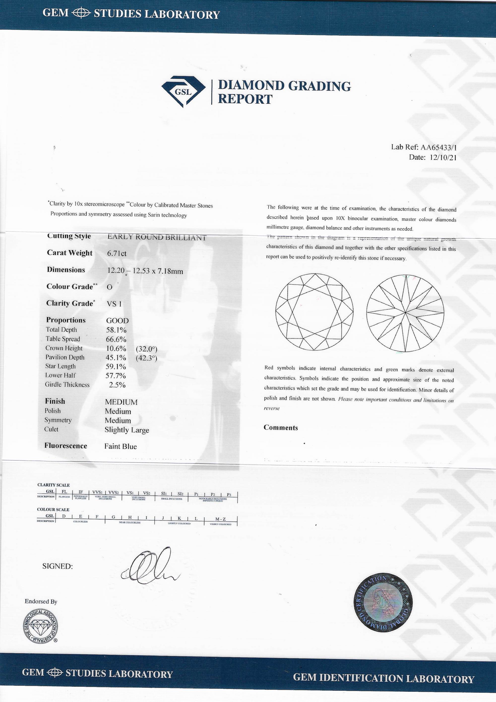 Accompanied by a GSL report number AA65433/1, dated 12 October 2021, stating that the 6.71 carat diamond is natural of O colour, VS1 clarity.