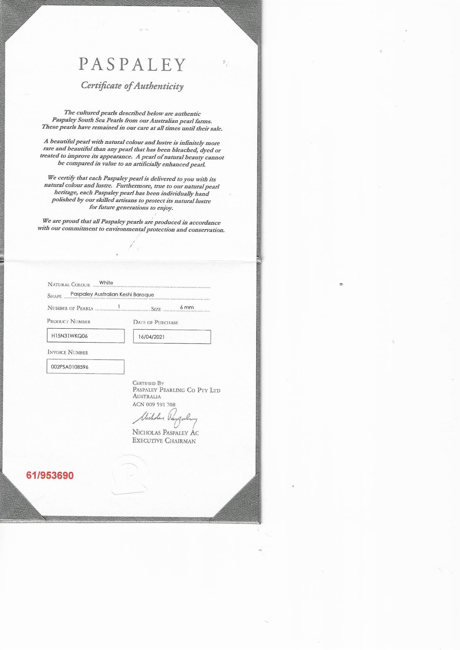a Paspaley Certificate of Authenticity numbered H15N31WKQ06;