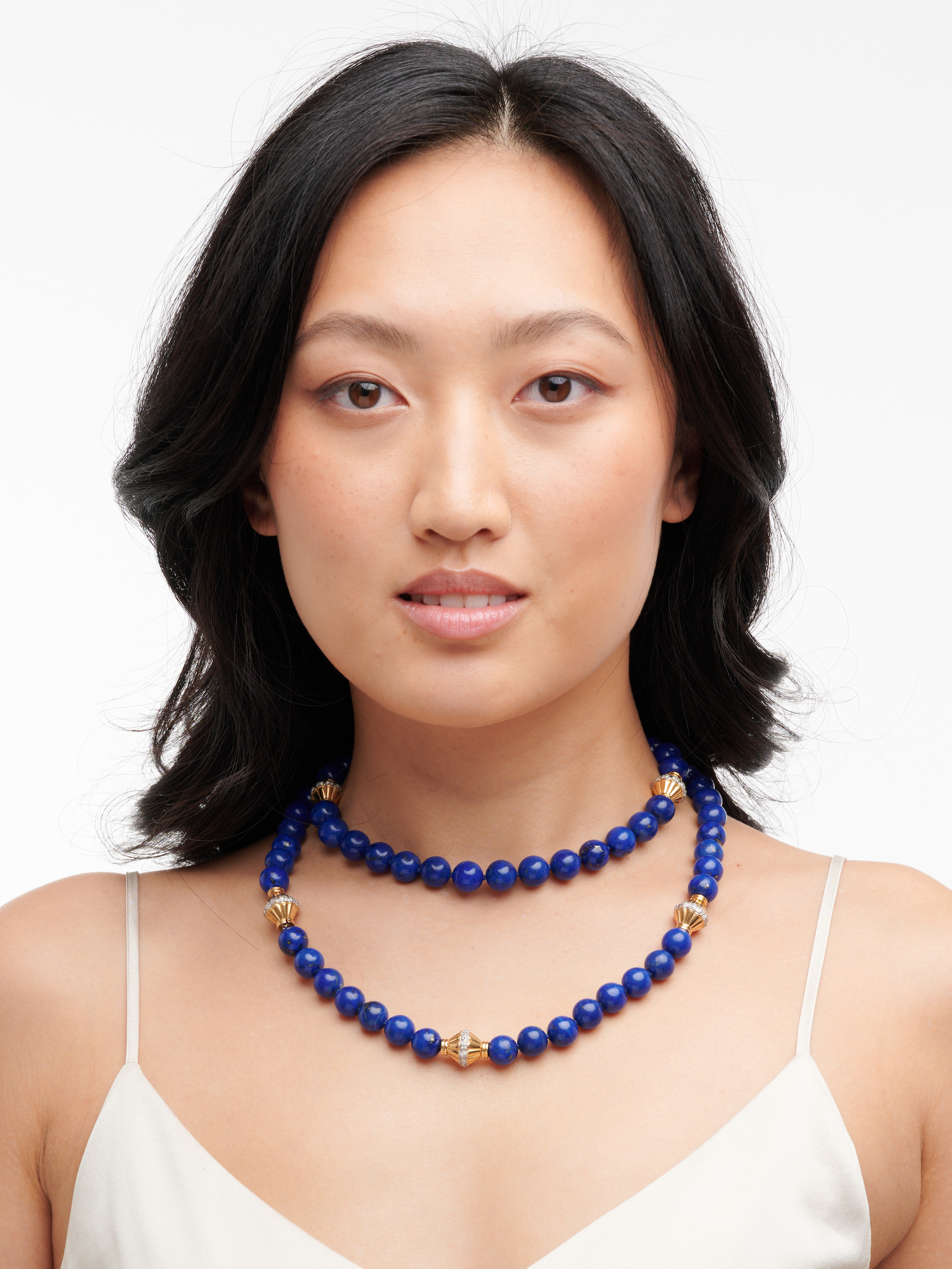 Composed as a uniform row of lapis beads measuring approximately 12.0mm spaced at intervals by polished fluted gold motifs decorated with bands of brilliant-cut diamonds, the necklace detaches to be worn at varying lengths, overall length approximately 980mm.