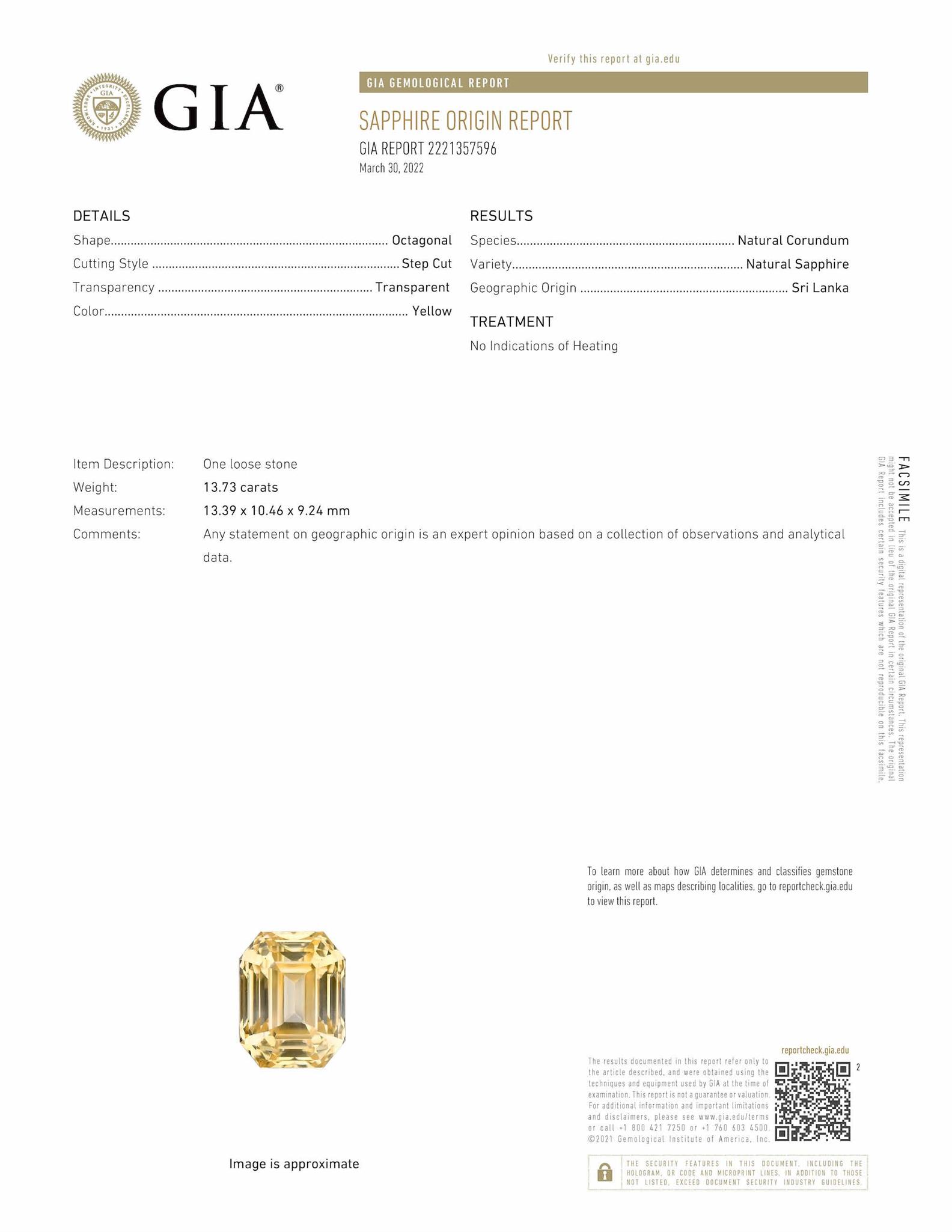 Accompanied by a GIA report numbered 2221357596, dated 30 March 2022, stating that the 13.73 carat yellow sapphire is natural, with no indications of heating, of Sri Lanka origin.