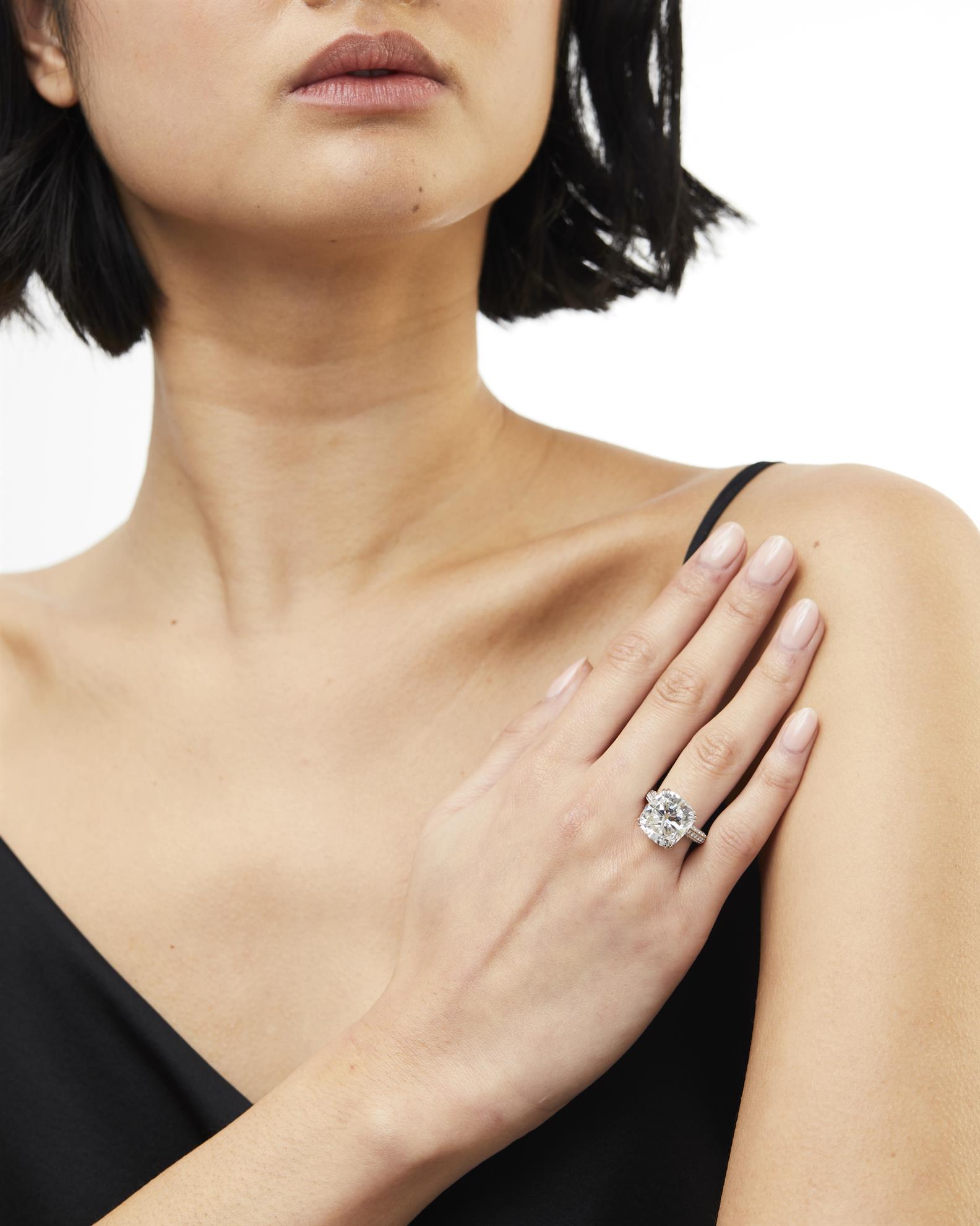 The cushion modified brilliant-cut diamond weighing 11.03 carats, is claw-set between shoulders and gallery pavé-set with brilliant-cut diamonds, mounted in 18ct white gold, size K1/2.