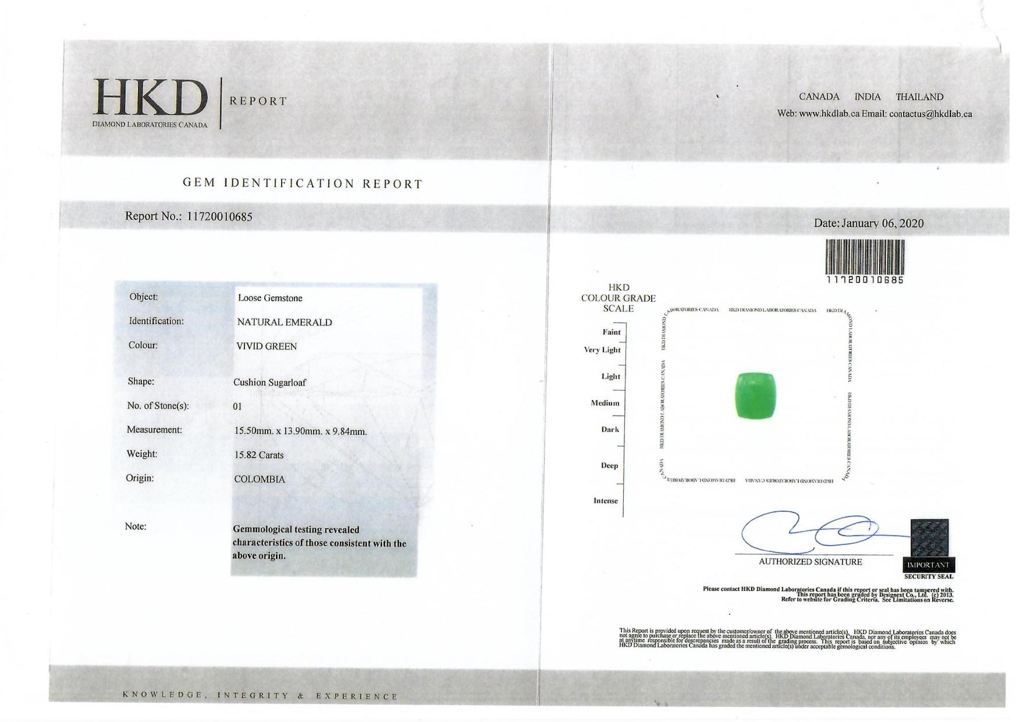 Centring a claw-set cushion sugarloaf-cut emerald weighing 15.82 carats, within a surround of brilliant-cut diamonds together weighing 0.21 carats, size N. Accompanied by a copy of HKD Gem Identification Report number 11720010685 stating the 15.82 carat emerald is Colombian.