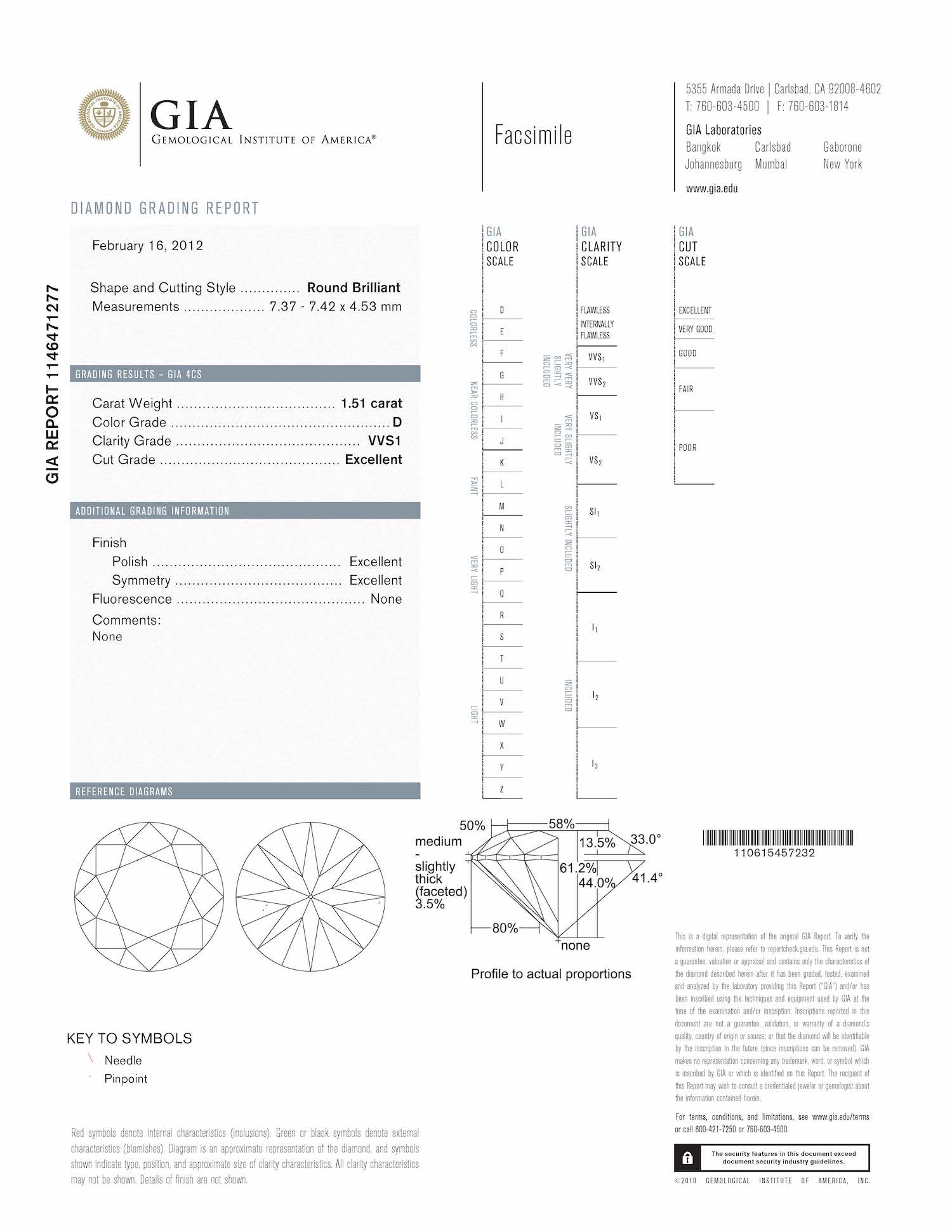 a GIA report numbered 1146471277, dated 16 February 2012, stating that the 1.51 carat diamond is natural, D colour, VVS1 clarity;