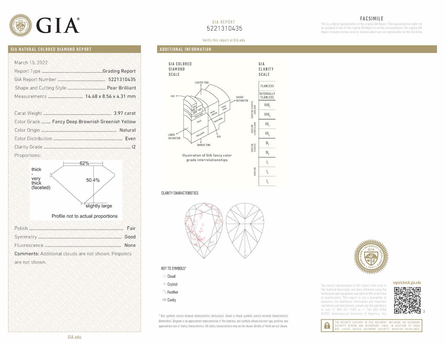 Accompanied by a GIA report numbered 5221310435, dated 15 March 2022, stating that the 3.97 carat diamond is natural, fancy deep brownish greenish yellow colour, I2 clarity.