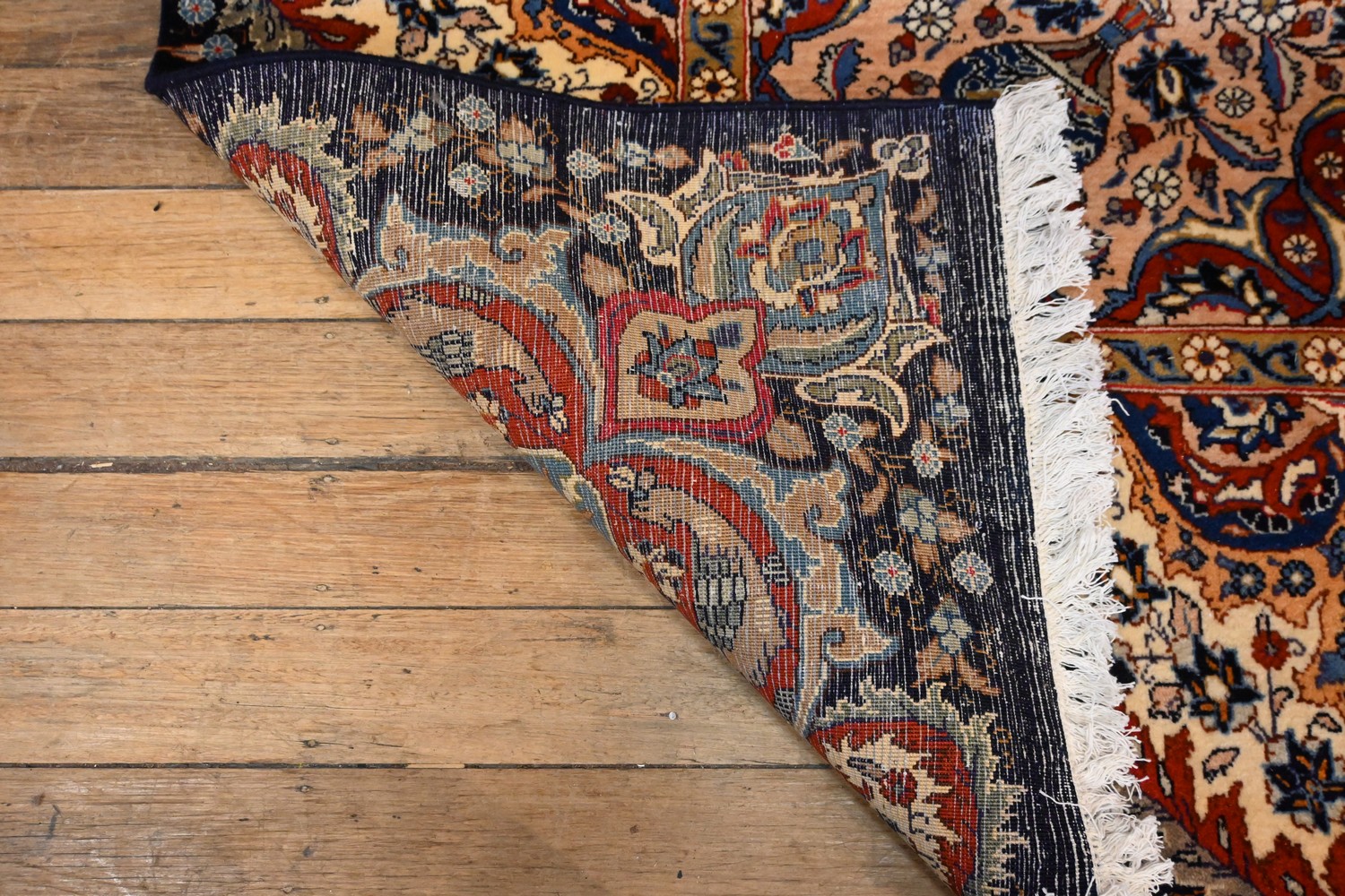 EX GALLERY -EXCEPTIONAL EXAMPLE OF TREASURE DESIGN PERSIAN KASHMAR CARPET, FINELY AND VERY DENSELY HAND KNOTTED WITH LUSTROUS WOOLLEN PILE. THIS SUPERB CARPET REPRESENTS AN ANCIENT ARCHAEOLOGY DESIGN DATING BACK TO THE ACHAEMENID EMPIRE, INCLUDING ANTIQUITY MOTIFS OF VASES & WINE JARS DISCOVERED FROM THE CITY OF PERSEPOLIS ALSO INCLUDING THE LEGENDARY BIRD OF PHOENIX KNOW AS THE SYMBOL OF POWER IN PERSIAN MYTHOLOGY THROUGHOUT THE FIELD AND BORDERS. THE CARPET HAS A VIBRANT CENTRAL MEDALLION IN DEEP PERSIAN INDIGO FIELD, FRENCH BLUE, GOLD AND CHAMPAIGN COLOURS. A HIGHLY RARE & COLLECTABLE EXAMPLE OF KASHMAR CARPET FROM CENTRAL EAST OF PERSIA. SIGNED PIECE. SIZE: 395 X 303 CM ORIGIN: PERSIA - RRP: $9,900 DOCUMENTATION OF AUTHENTICITY INCLUDED.