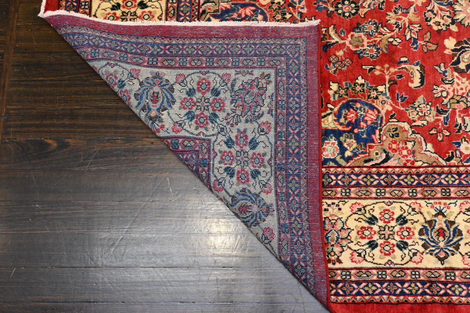 A STUNNING CIRCA 1980'S PALATIAL SIZE PERSIAN SAROUQ MAHAL CARPET. 100% HAND SPUN WOOL, DENSE SOLID PILE, ORGANIC DYES. FINELY HAND KNOTTED WITH TRADITIONAL DESIGN OF CENTRAL MEDALLION & QUARTERED CORNER MEDALLIONS IN FRENCH BLUE, IVORY & ROSE ON A SOFT MELLOW RED FIELD HIGHLIGHTED IN CORAL. WITH FLORAL SPRAYS, PALMETTES IN TONES OF FRENCH BLUE AND PISTACHIO GREEN. MAJOR BORDER IN CHAMPAGNE OF PALMETTES & FLORAL SPRAYS. EX-GALLERY EXHIBITED CARPET. ORIGIN: PERSIA - RRP: $12,000 - SIZE: 480 X 332 CM. DOCUMENTATION OF AUTHENTICITY INCLUDED