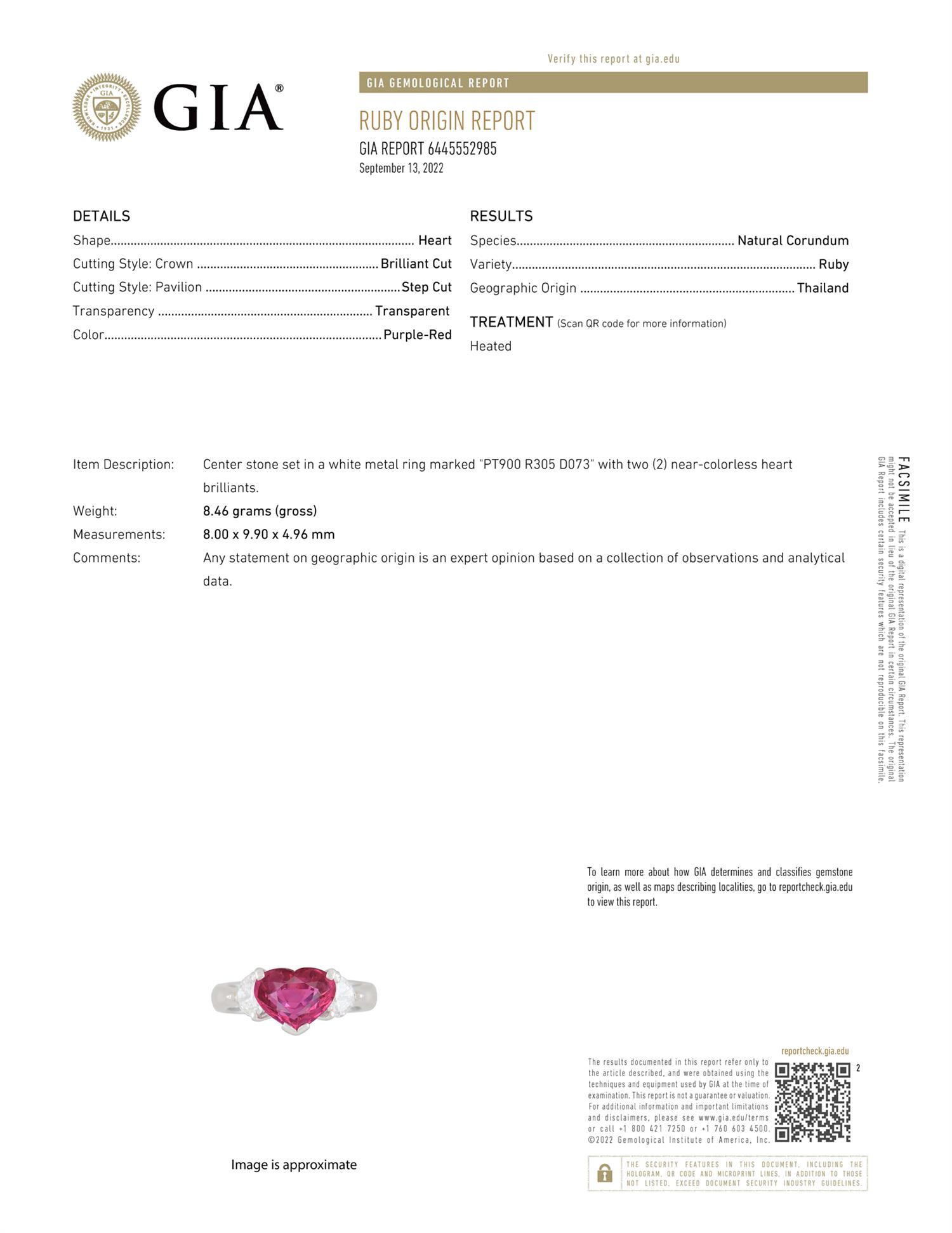 Accompanied by a GIA report numbered 6445552985, dated 13 September 2022, stating that the ruby is natural, with indications of heating, of Thailand origin.