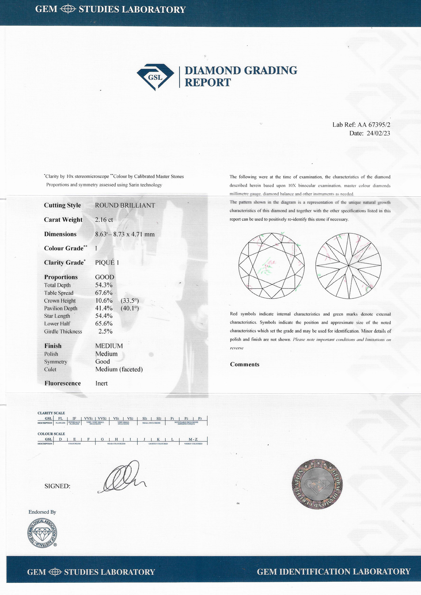 Accompanied by a GSL report numbered AA67395/2, dated 24 February 2023, stating that the 2.16 carat diamond is natural, I colour, piqué 1 clarity.