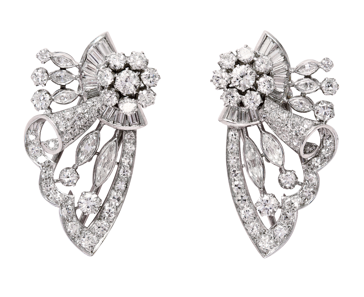 Designed as a stylised swag of ribbons set with marquise, baguette, brilliant-cut and circular-cut diamonds supported from a later platinum wheatsheaf chain completed by a bow-shaped box clasp decorated with diamonds, the diamonds together weighing approximately 8.78 carats, mounted in platinum with a 14ct white gold frame, convertible to form a double-clip brooch, a pair of double-clips, or a pair of earrings, inner circumference 435mm, total gross weight approximately 66 grams.