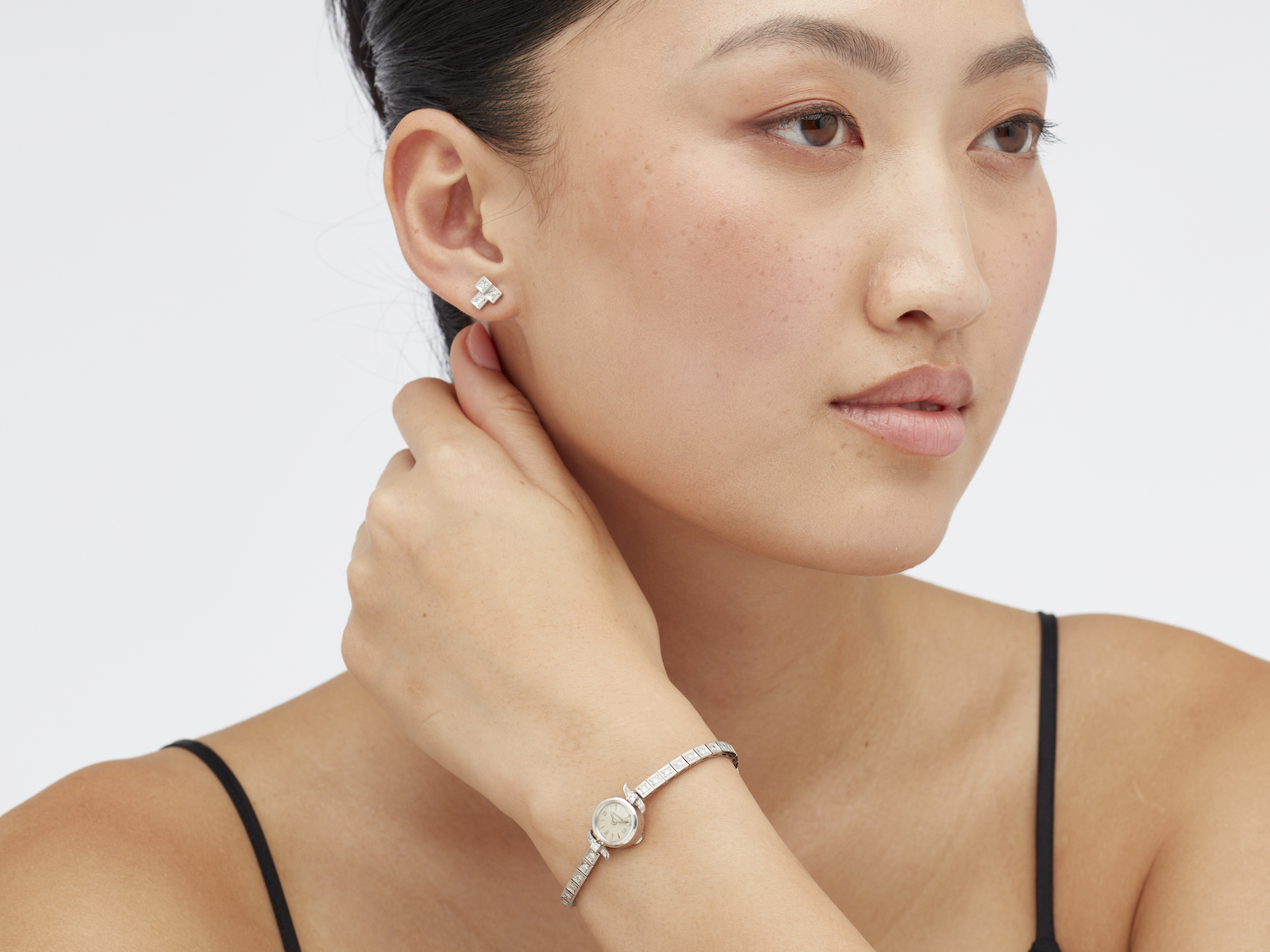 JAEGER-LECOULTRE A LADY'S 18CT WHITE GOLD AND DIAMOND-SET BRACELET WATCH AND EARRING SUITE CIRCA 1960