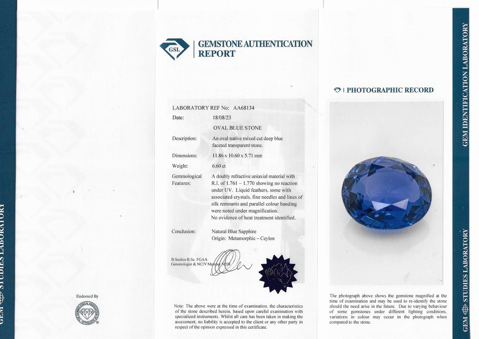 Accompanied by a GSL report numbered AA68134, dated 18 August 2023, stating that the 6.60 carat sapphire is natural, with no indications of heating, of Ceylon (Sri Lanka) origin.