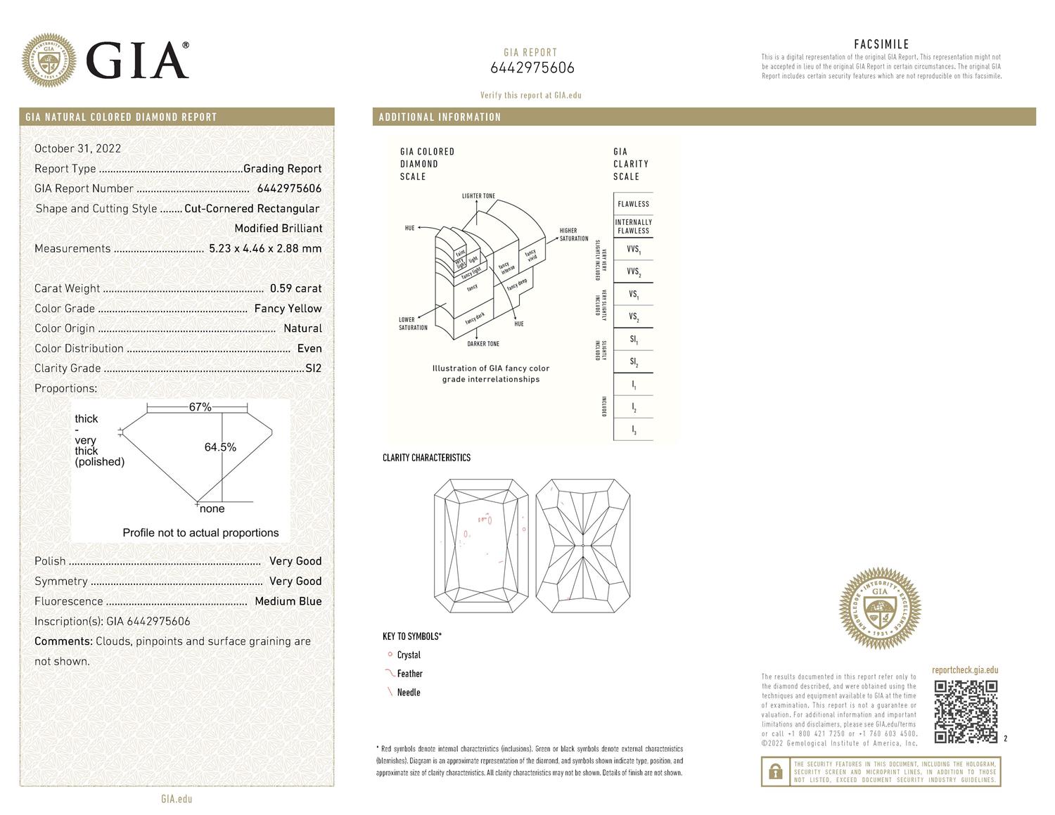 a GIA report numbered 6442975606, dated 31 October 2022, stating that the 0.59 carat diamond is natural, fancy yellow colour, SI2 clarity, laser inscribed;