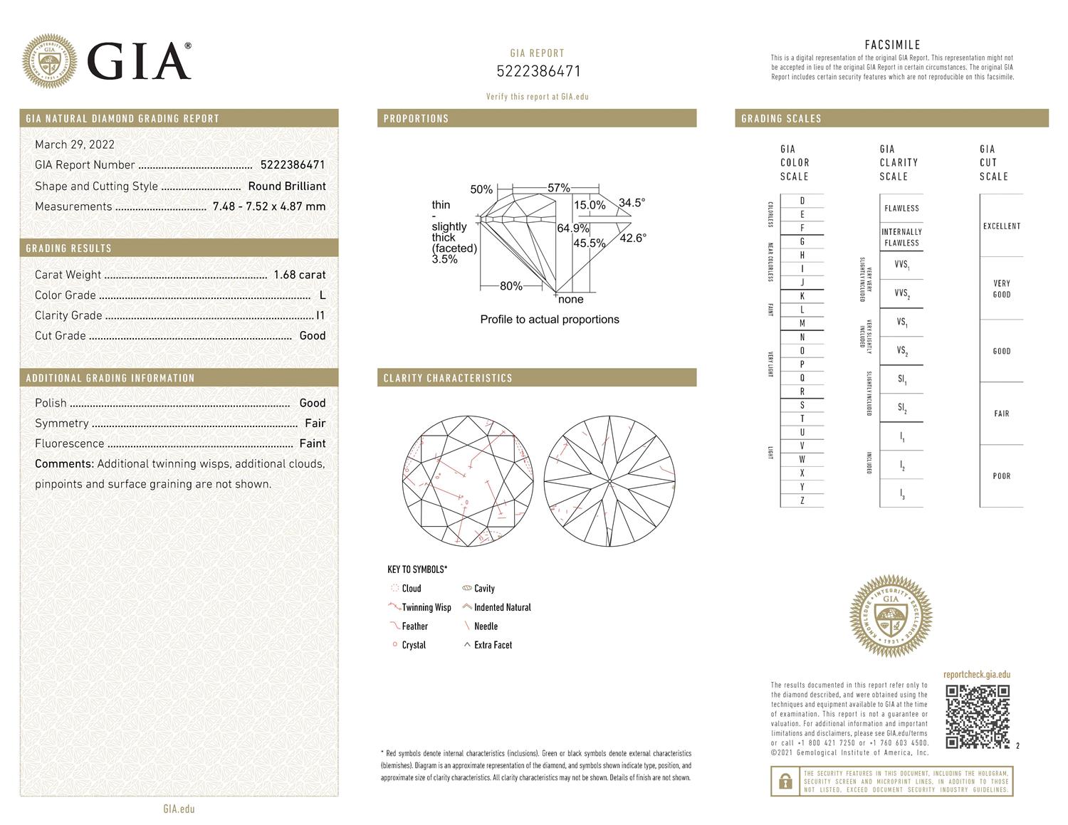 Accompanied by a GIA report numbered 5222386471, dated 29 March 2022, stating that the 1.68 carat diamond is natural, L colour, I1 clarity.
