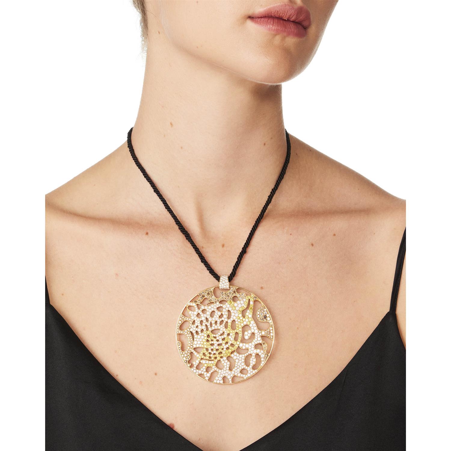Designed as a circular plaque with a half round flange, portraying an openwork panther facing dexter, embellished with yellow, brown and near colourless brilliant-cut diamonds, supported from a bail pavé-set with near colourless diamonds, completed by an adjustable silk cord terminating in gold cylindrical terminals pavé-set with diamonds between a similarly set glide, pendant diameter 71mm, inner circumference approximately 1000mm, adjustble, numbered 5xxxxB, French assay marks, signed Cartier.