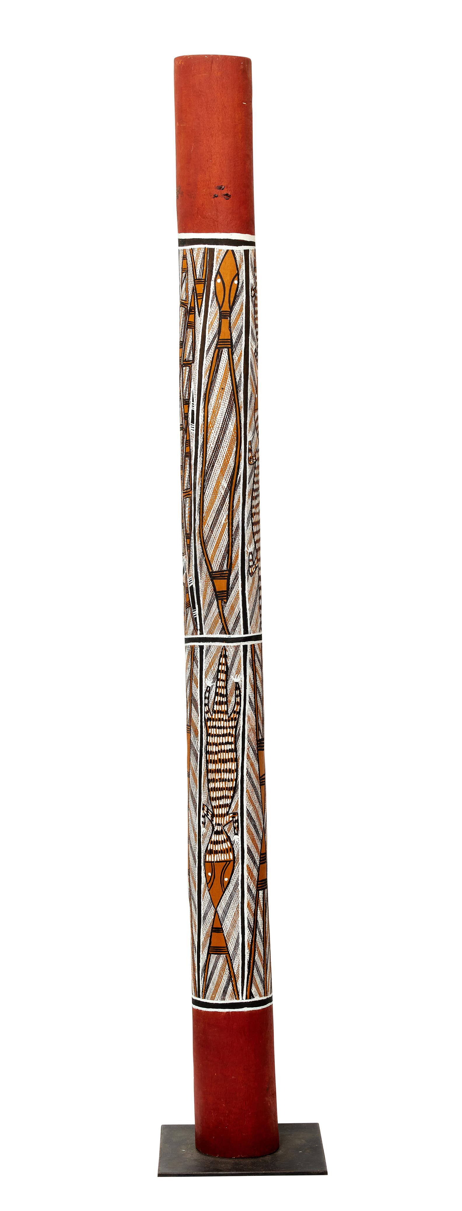 This piece was commissioned by Djon Mundine OAM for inclusion in The Aboriginal Memorial which was first exhibited in the 1988 Sydney Biennale and now resides permanently on display in The National Gallery of Australia, Canberra. The Memorial consists of 200 hollow log coffins created by 43 artists from Central Arnhem Land, including five by Djardi Ashley. This lot was not included in the final installation of the Memorial and Djon Mundine subsequently arranged the sale to the current owner via an art advisor on Bathurst Island. The present lot features Ashley's characteristic interlocking triangular designs which typically represent spearheads associated with the Wagilag Sisters' Story, an important Aboriginal creation myth.