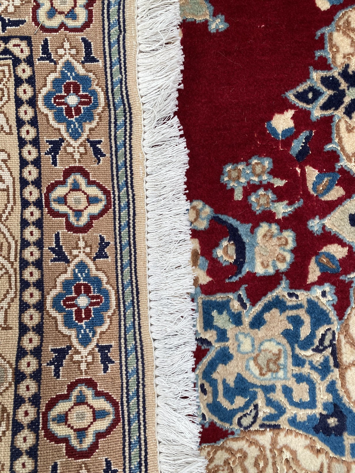 A PERSIAN NAIEN WOOL AND SILK RUG. APPROXIMATELY 400,000 INDIVIDUAL KNOTS PER SQUARE METER. HAND-KNOTTED CLASSIC NAIEN DESIGN OF DOMINANT FLORAL MEDALLION AND QUARTERED CORNER MEDALLIONS IN CREAM, CARAMEL, INDIGO AND BABY BLUE, SET WITHIN AN OPEN CRIMSON FIELD. BORDER OF ROSETTES. ORIGIN: IRAN (128 X 90 CM) (PLEASE NOTE THERE MAY BE SOME COLOUR VARIATION FROM PHOTOGRAPH)