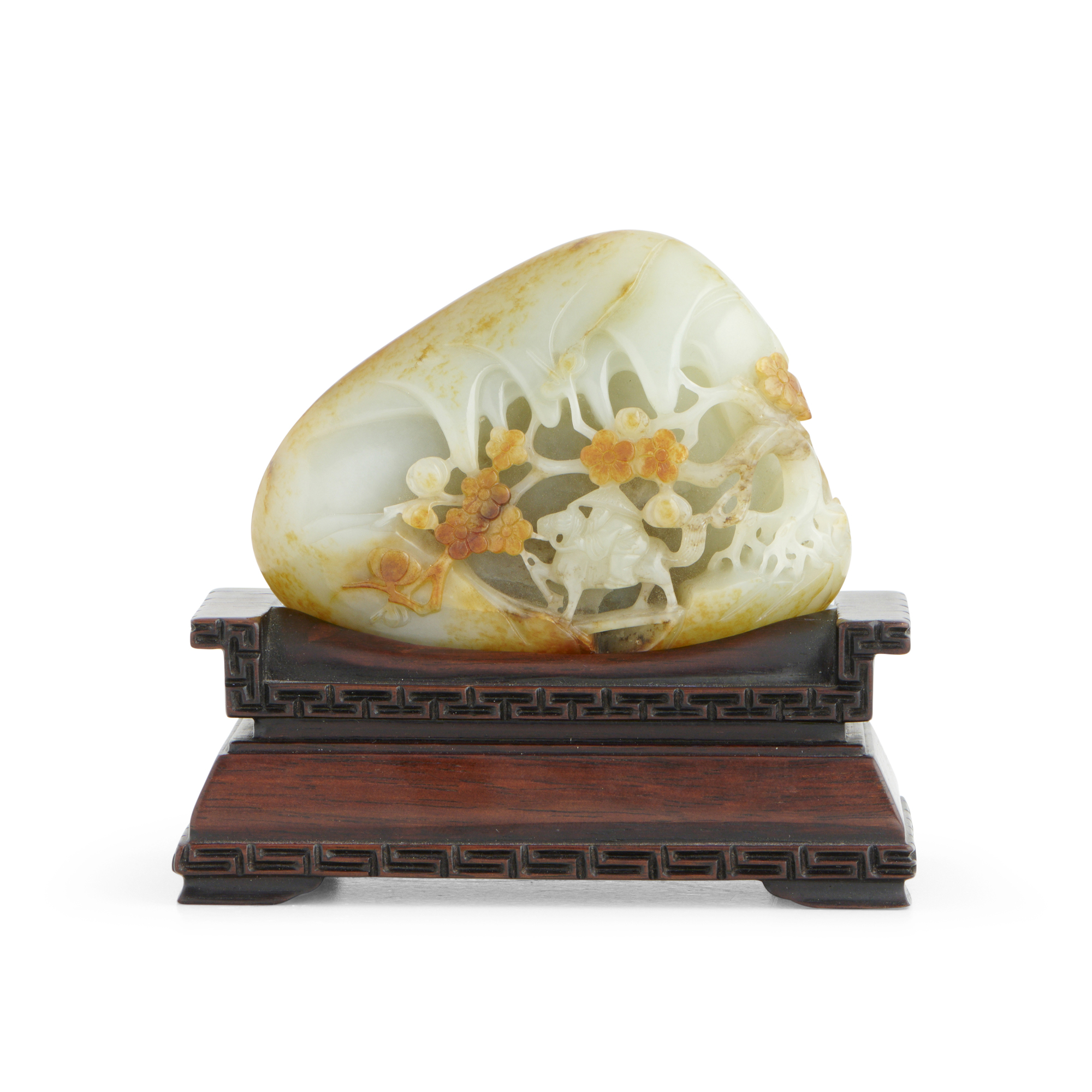 The boulder is finely carved on one side with a scholar on a horse in a mountain landscape. The reverse side further carved with rocks. The white jade with areas of enhanced russets. It's with a carved fitted zitan stand and a fitted box.