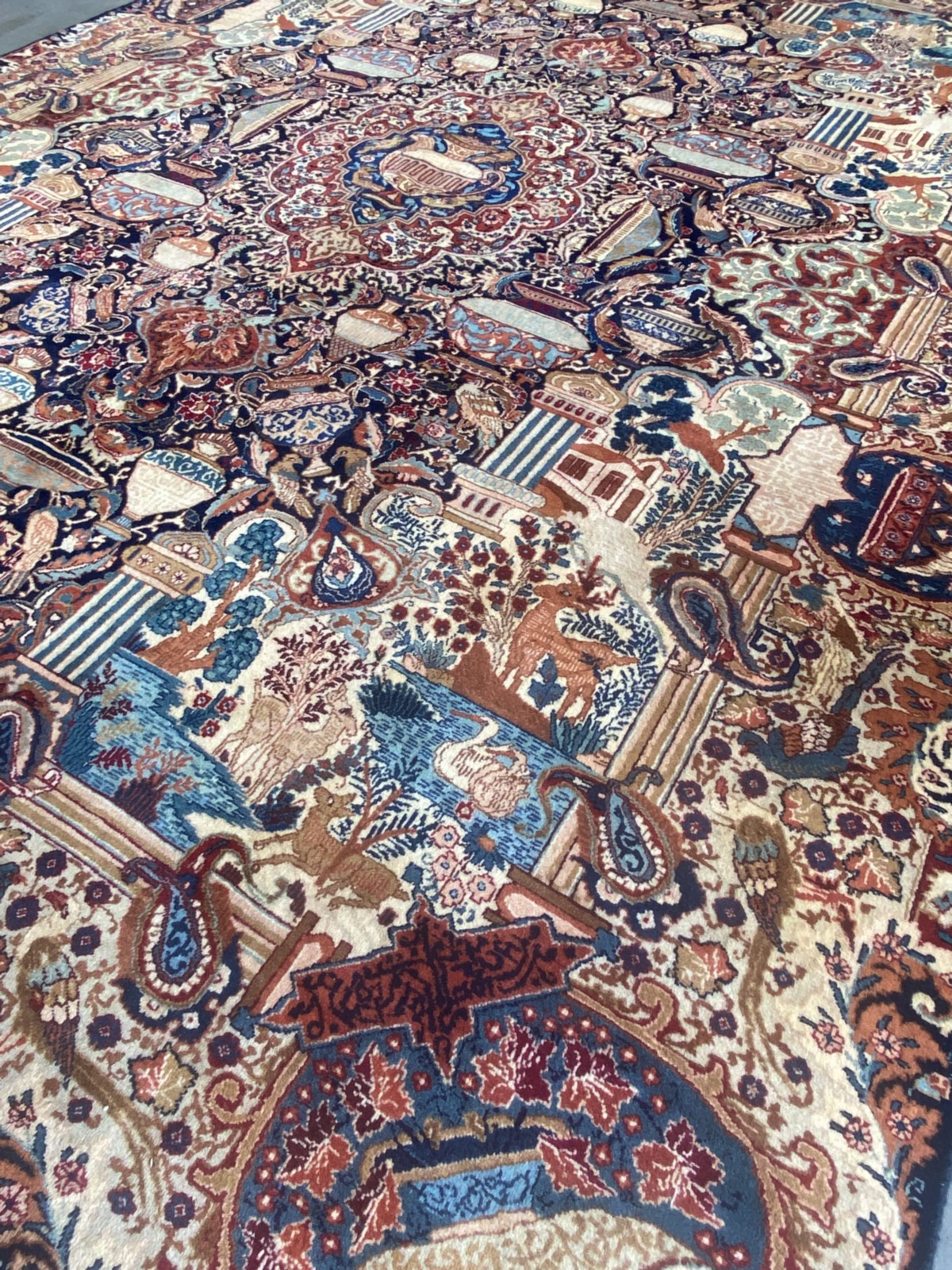 GALLERY EXHIBITED. SOLID & PLUSH WOOL PILE. HAND-KNOTTED CITY WEAVE FROM THE NORTH-EASTERN KHORASAN PROVINCE WITH CENTRAL MEDALLION CONTAINING AN EXCAVATED URN IN AN INDIGO FIELD PF SYMMETRIC URNS, PILLARS & PHEASANTS. CORNER MEDALLIONS CONTAINING DEER, GOATS, SWANS & FLORAL SHRUBS. ELABORATE BORDER OF URNS, FLORAL SPRAYS, PHEASANTS AND PAISLEY MOTIFS.
