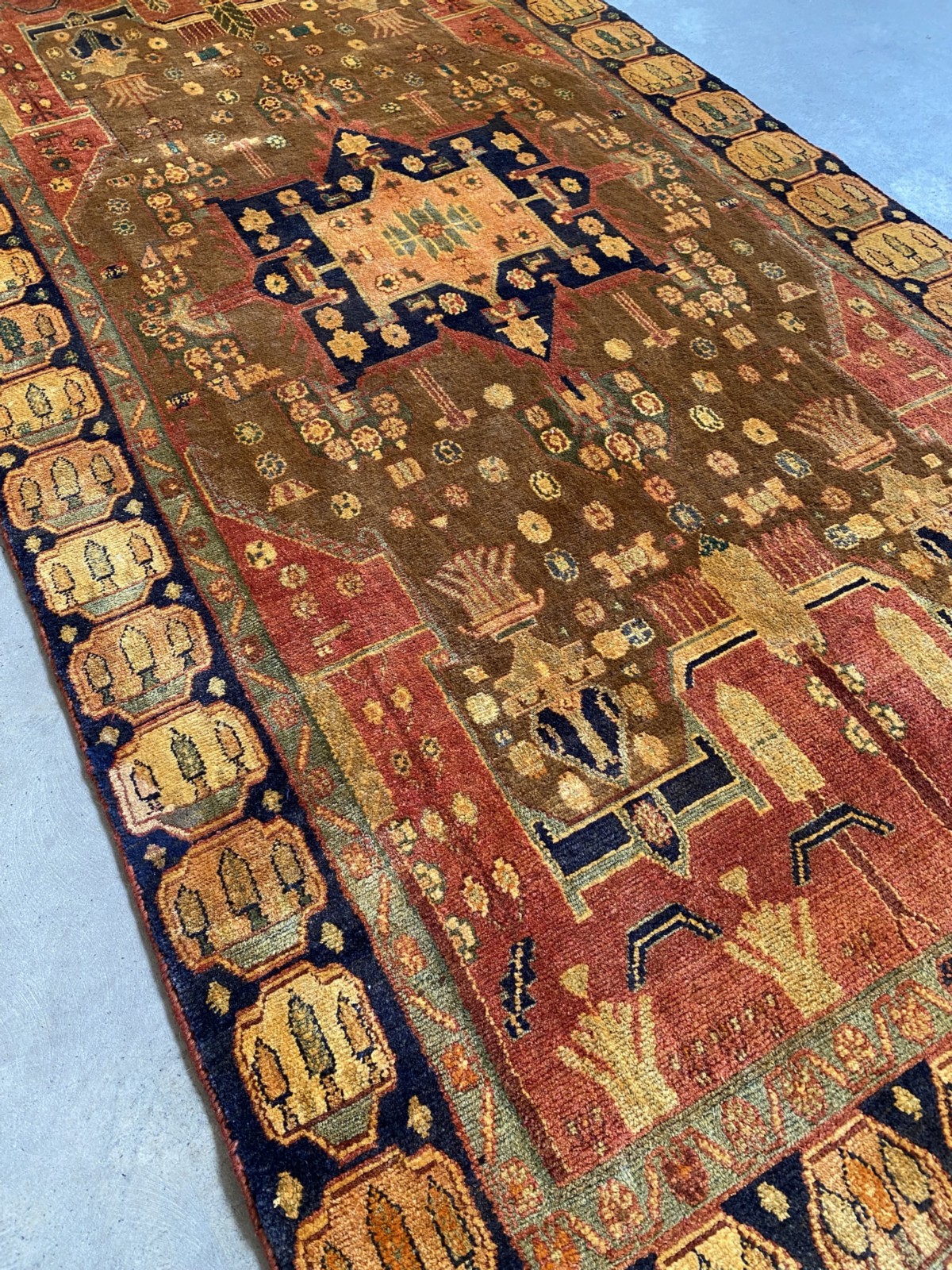 A WOOL PILE & VEGETABLE DYES. HAND-KNOTTED SEMI-TRIBAL WEAVE FROM THE KURDISTAN REGION WITH BOLD ANGULAR MEDALLION IN CORNER MEDALLIONS IN A FIELD OF FLOWER HEADS. PANELLED BORDER OF CYPRESS TREES. THE ENTIRE IN SHADES OF CARAMEL, TERRACOTTA, INDIGO, SAFFRON & GREEN.