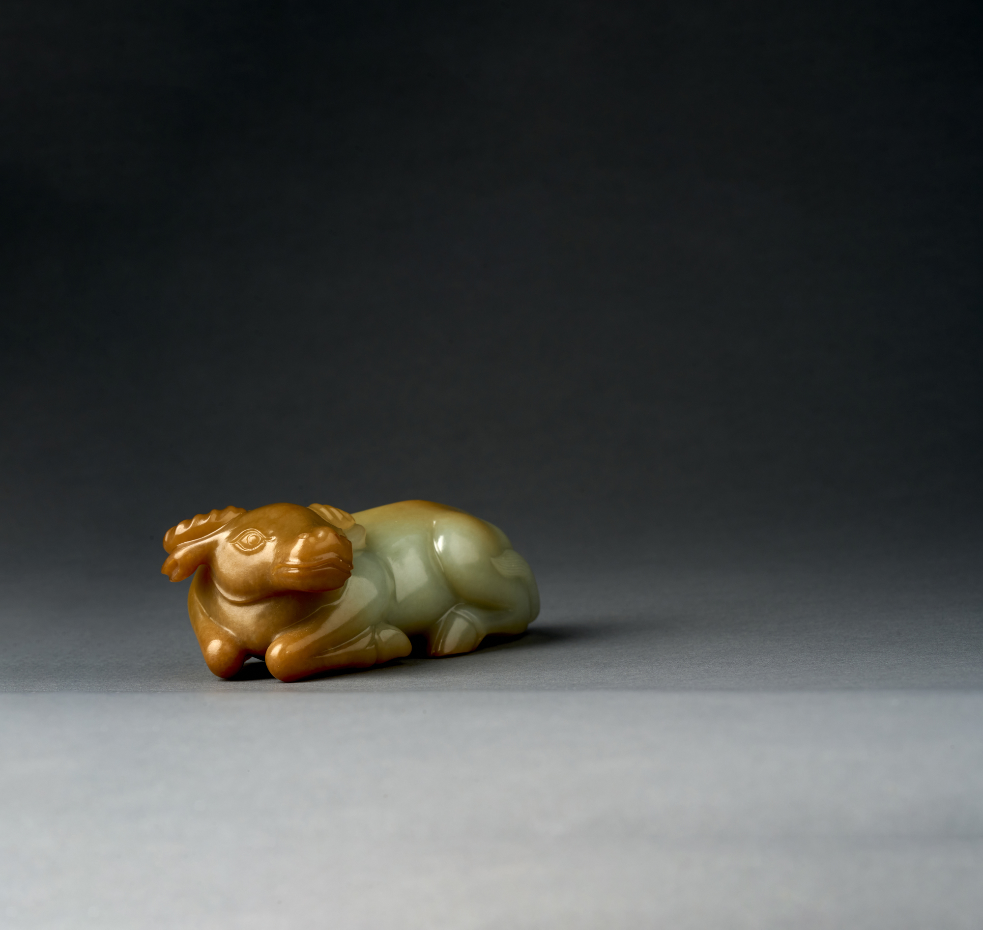 A CHINESE CELADON AND RUSSET JADE CARVING OF RECUMBENT BUFFALO, QING DYNASTY, 18TH CENTURY