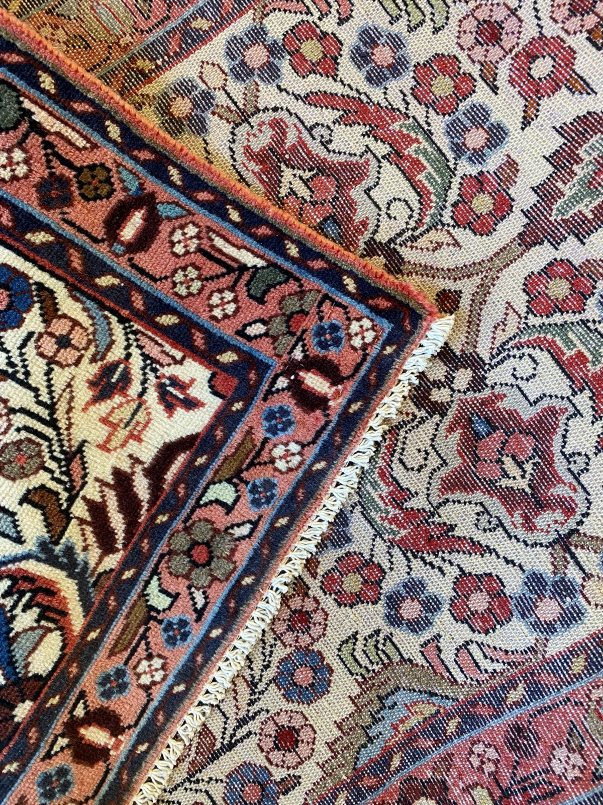 SOLID & DENSE WOOLLEN PILE. HAND-KNOTTED WEAVE FROM THE NORTH-WESTERN AZERBAIJAN PROVINCE WITH TRADITIONAL DESIGN OF ALL-OVER FLORAL SPRAYS & RAMBLING TENDRILS. BORDER OF FLOWER HEADS & TENDRILS. THE ENTIRE IN SHADES OF CREAM, FRENCH BLUE, PEACH & TERRACOTTA.