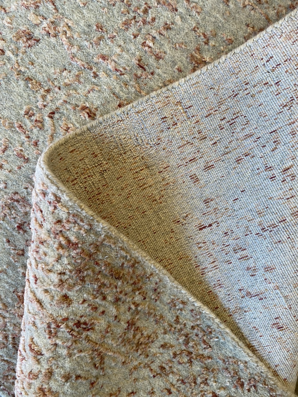 HAND-WOVEN LOOM KNOT. WOOL & SILK TEXTURE PILE. TRANSITIONAL DESIGN OF ALL-OVER ERASED & EMBOSSED PALMETTES & FLORAL PATTERNS IN SHADES OF SILVER & COPPER.