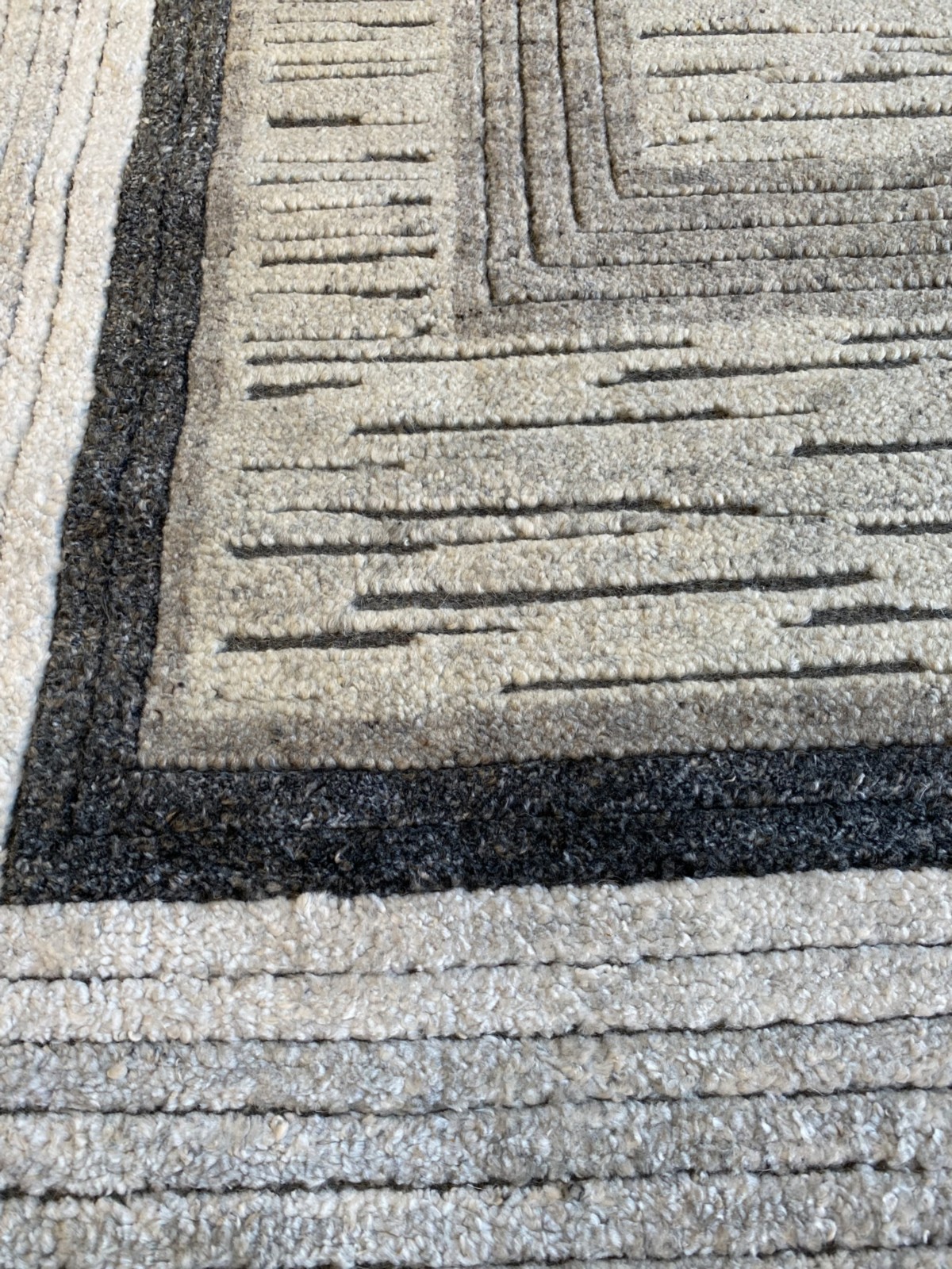 WOOLLEN WARP, WEFT & PILE. HAND-KNOTTED. SOFT PLUSH PILE WITH AN ALL-OVER GEOMETRIC DESIGN IN SOFT SHADES OF BEIGE, CREAM & GREY.