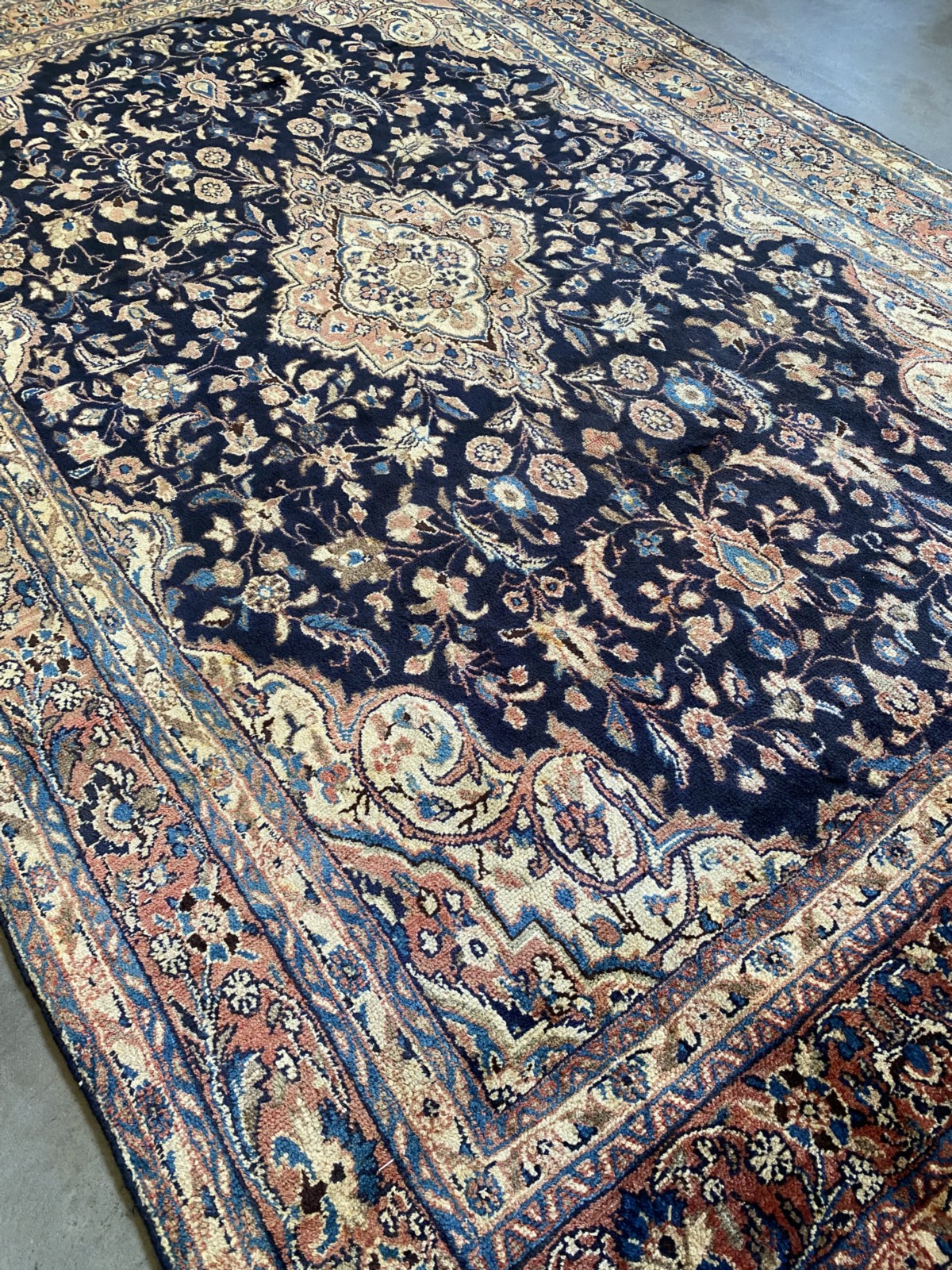 DENSE WOOLLEN PILE. HAND-WOVEN VILLAGE WEAVE FROM THE HAMADAN REGION WITH CLASSIC PERSIAN DESIGN OF A CHANDELIER MEDALLION AND PALMETTES, FLORAL SPRAYS & TENDRILS IN SUBTLE SHADES IF PEACH, CREAM & CORNFLOWER BLUE SET WITHIN AN INDIGO FIELD. BORDER OF PALMETTES & FLOWER HEADS.
