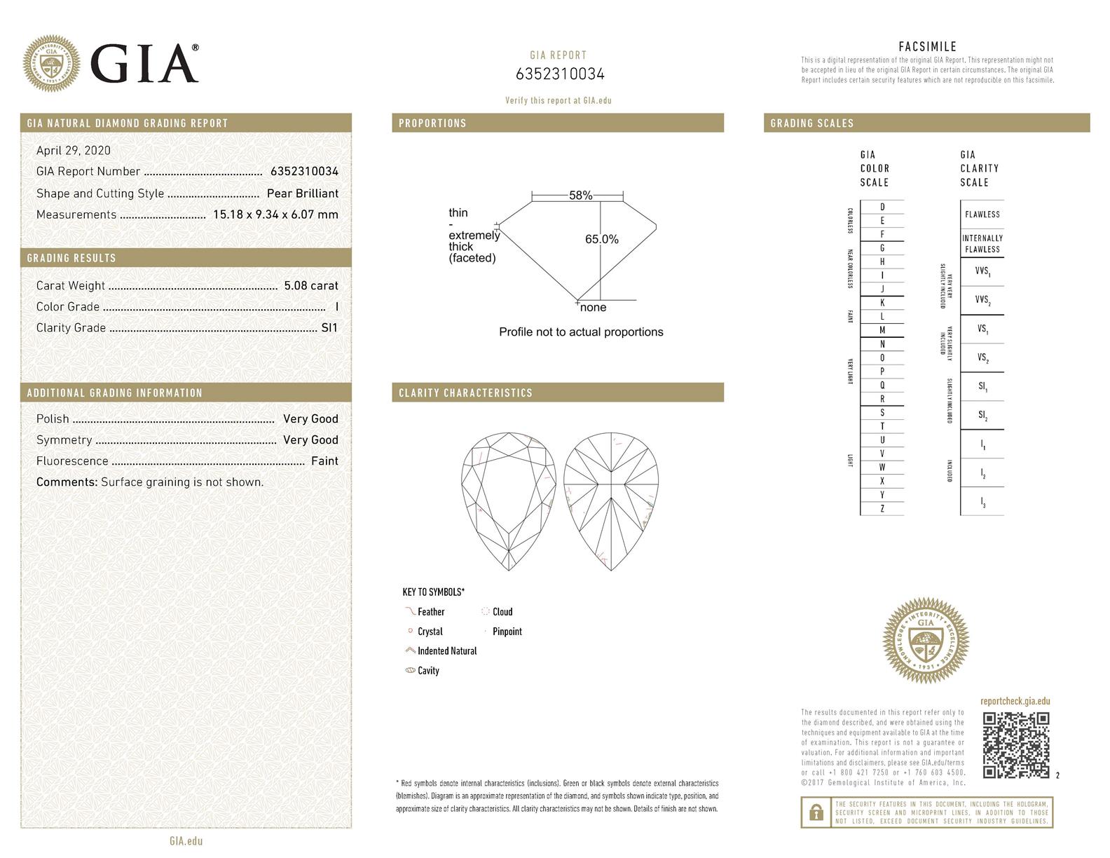 Accompanied by a GIA report numbered 6352310034, dated 29 April 2020, stating that the 5.08 carat diamond is natural, I colour, SI1 clarity.