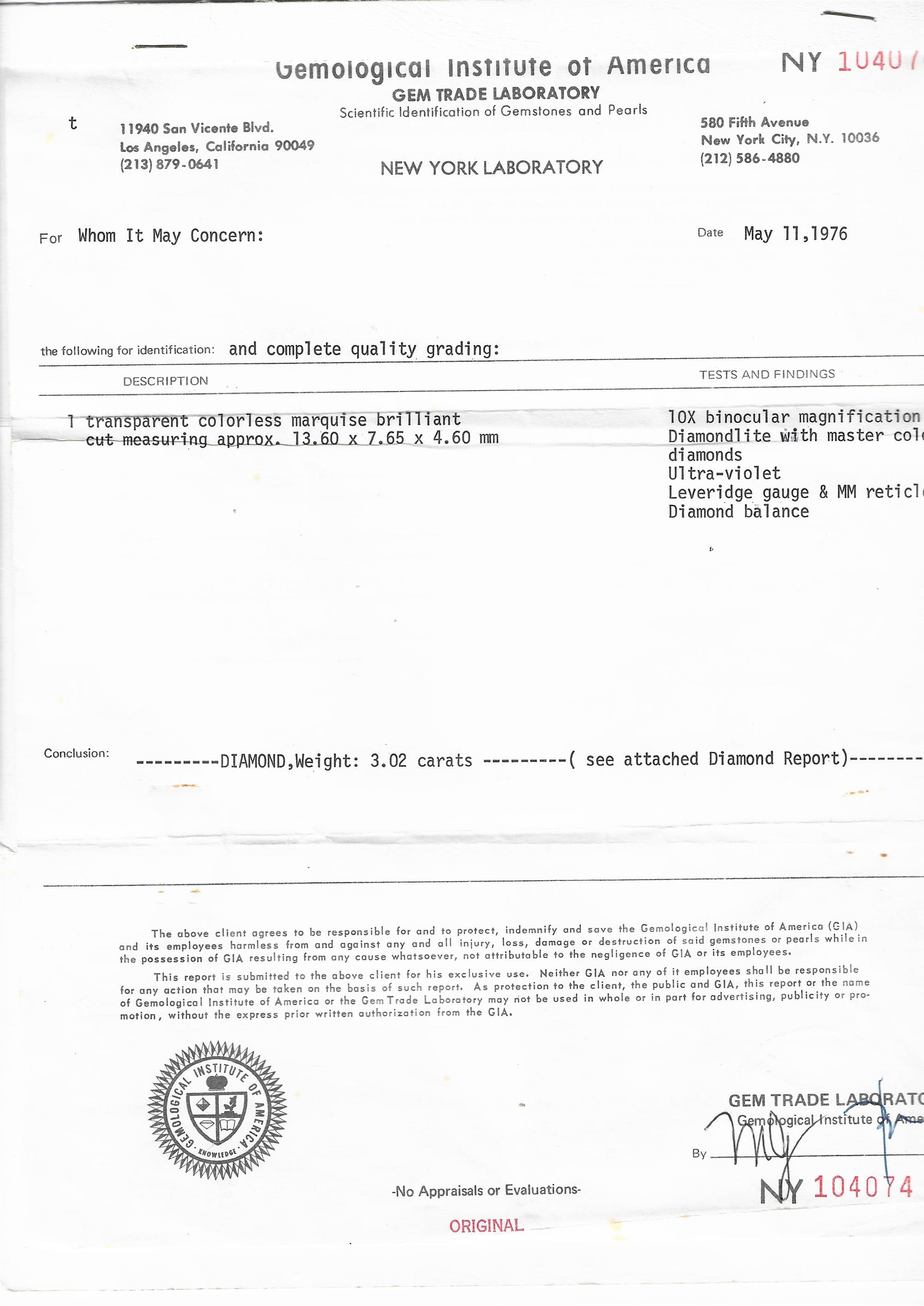 Accompanied by a GIA report numbered NY104074, dated 11 May 1976, stating that the 3.02 carat diamond is natural, D colour, Flawless clarity.