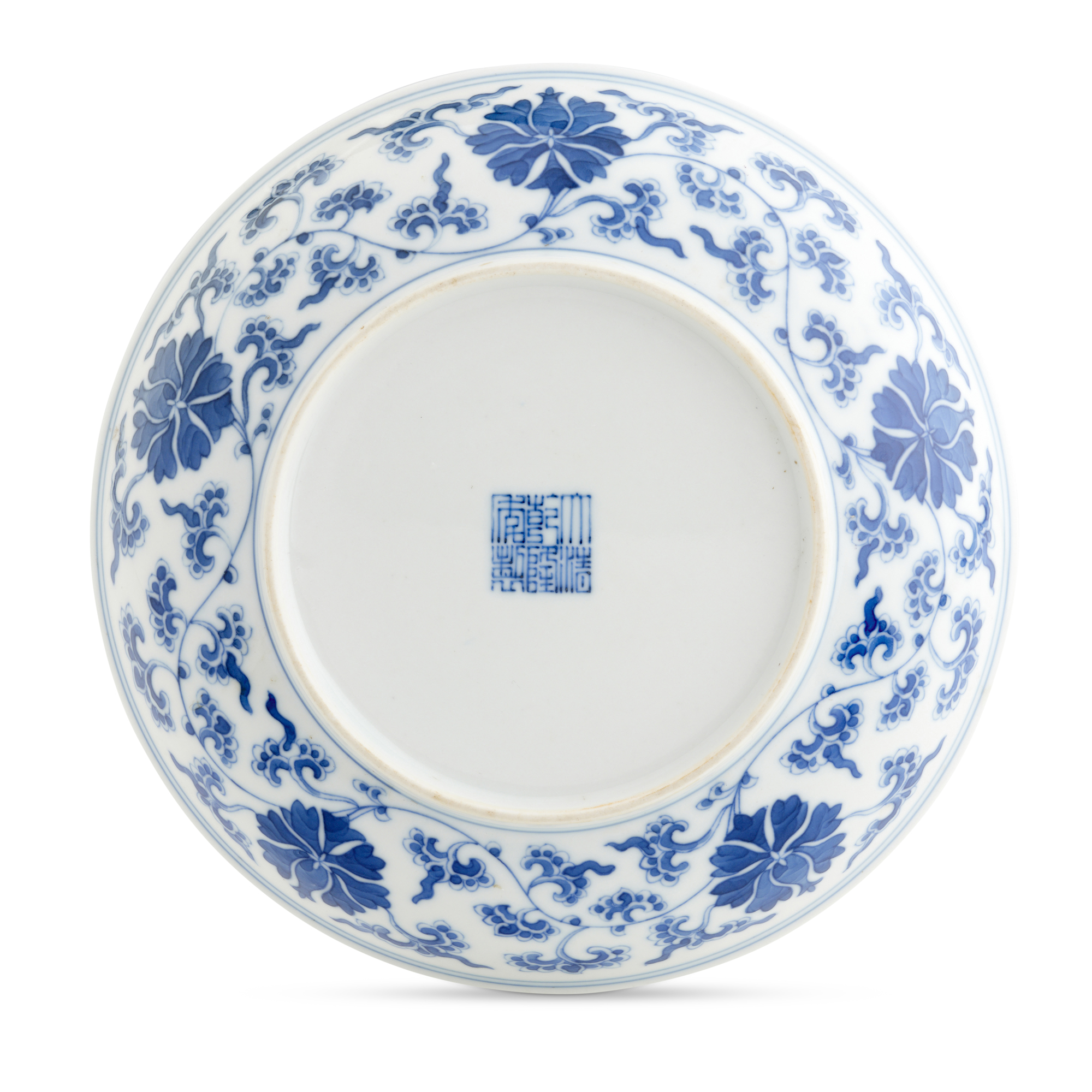 盤形端正,青花發色濃艷,底書「大清乾隆年製」六字款,為乾隆時期官窯器