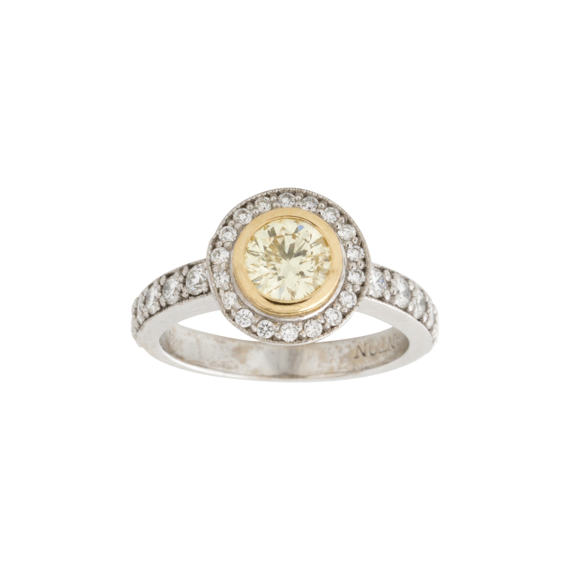 Of cluster design, centring a bezel-set fancy yellow round brilliant-cut diamond weighing approximately 0.75 carats, within a surround and shoulders detailed with bead-set round brilliant-cut diamonds together weighing approximately 0.48 carats, signed Anton, size L, gross weight approximately 6.5 grams.