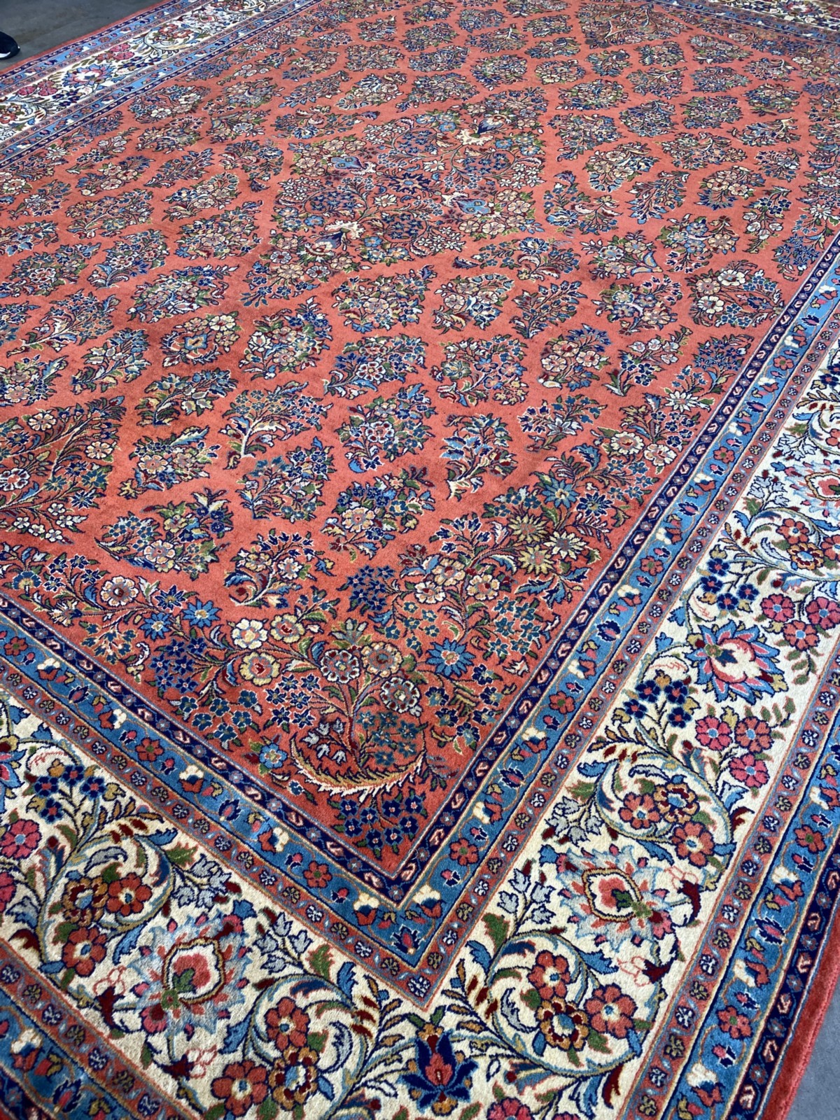 SEMI-VINTAGE WOOLLEN PILE. FINELY HAND-KNOTTED CITY WEAVE FROM THE MARKAZI PROVINCE WITH CLASSIC SAROUQ DESIGN OF A MEDALLION OF INTRICATE FLORAL MOTIFS IN A PERSIAN RED FIELD OF SYMMETRICAL FLORAL BOUQUETS. MAJOR BORDER OF PALMETTES AND FLORAL SPRAYS.
