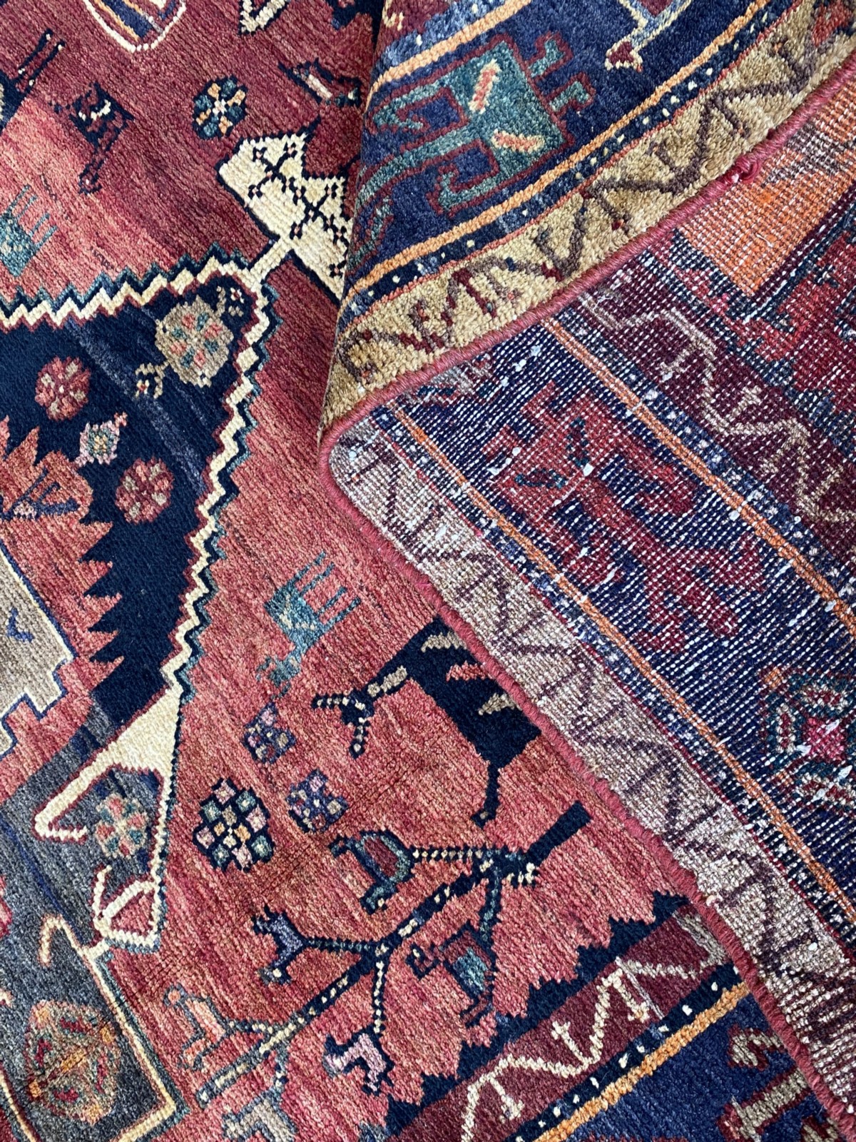 WOOL PILE & FOUNDATION & ORGANIC DYES WITH NATURAL ABRASH COLOUR VARIATION. HAND-KNOTTED NOMADIC WEAVE FROM THE SOUTHERN FARS PROVINCE WITH DESIGN OF A BOLD ANGULAR MEDALLION CONTAINING FLORAL MOTIFS & BIRD FORMS IN A FIELD OF TREE OF LIFE PATTERNS & DEER, GOAT & BIRD FORMS. BORDER OF GEOMETRIC PATTERNS.