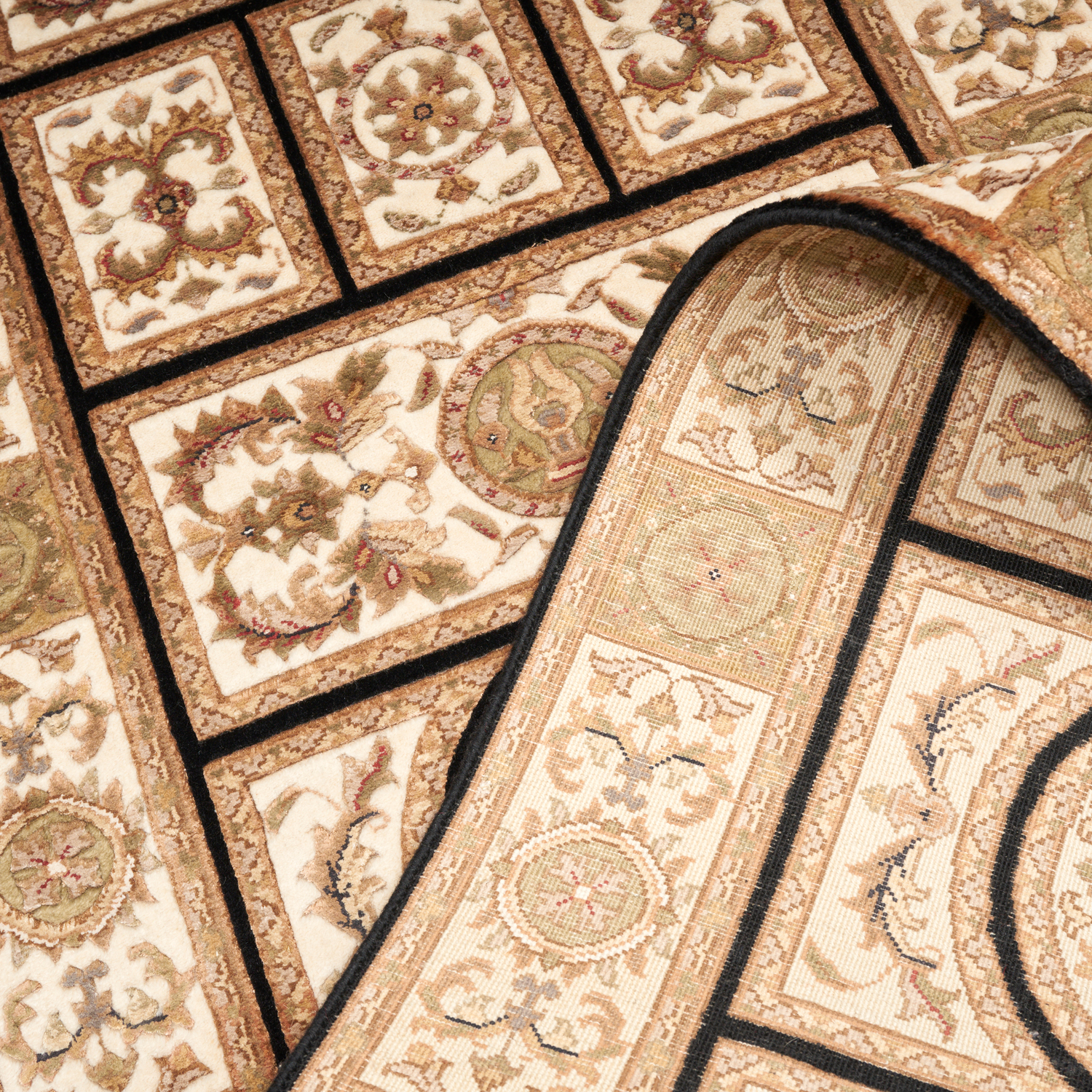FINE QUALITY WOOL PILE INTER-KNOTTED WITH SILK. FINELY HAND-KNOTTED WEAVE. CLASSIC FRENCH RENAISSANCE DESIGN OF A CIRCULAR CENTRAL MEDALLION CONTAINING A FLORAL MOTIF IN A SYMMETRICAL PANELLED FIELD OF CIRCULAR RENAISSANCE PANELS SET AGAINST ORNATE RAMBLING LEAF FORMS. THE ENTIRE IN SHADES OF ONYX, CREAM, OLIVE & PEACH.