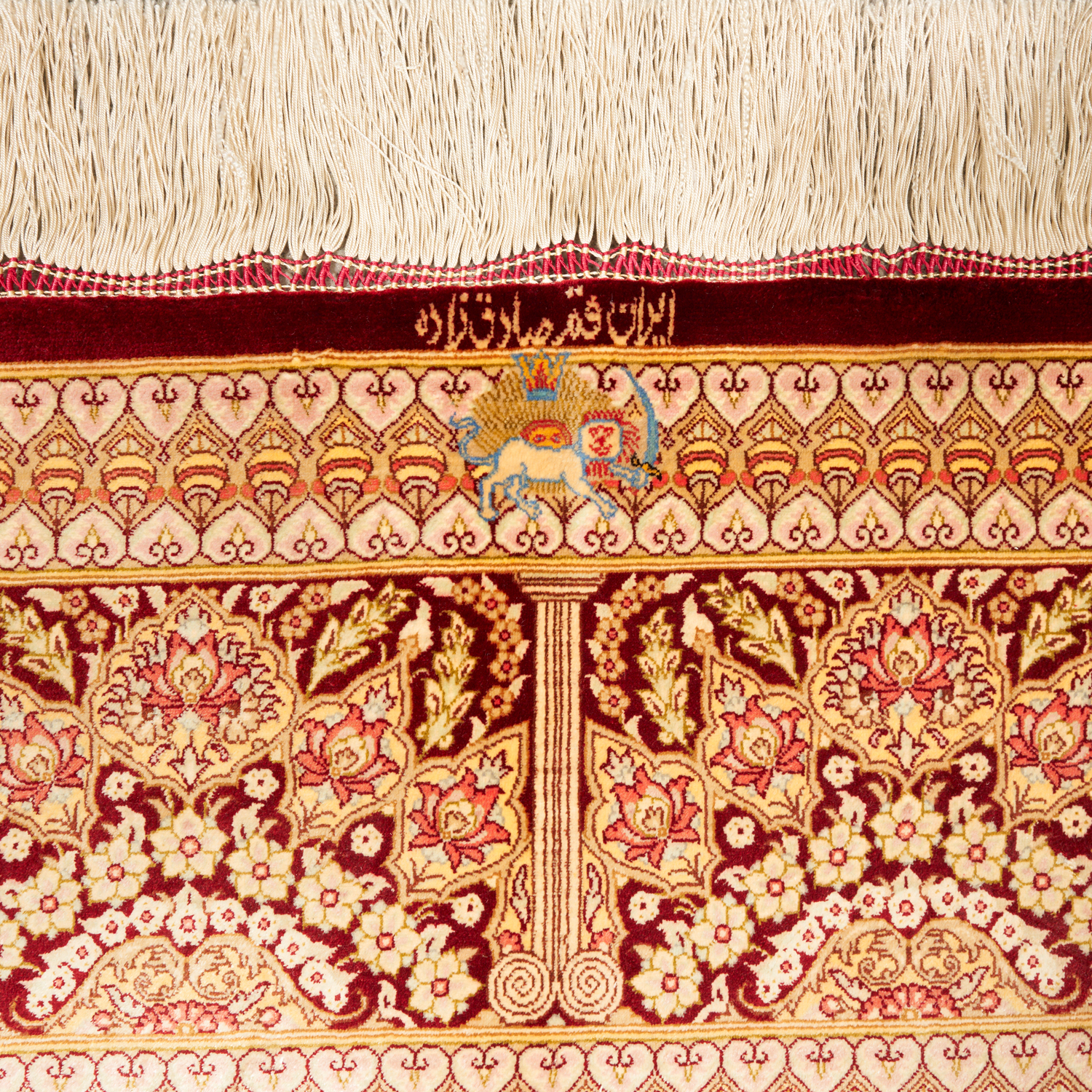 CASPIAN SILK. SUPERBLY HAND-KNOTTED WEAVE OF 800,000 KNOTS PER SQUARE METER BY "SADEGHZADEH" MASTER WEAVING ATELIER. SIGNED PIECE WITH THE PERSIAN ROYAL EMBLEM OF THE LION, SUN & SWORD. CLASSIC QUM FLORAL DESIGN OF A DOMINANT FLORAL MEDALLION & QUARTERED CORNER MEDALLIONS WITHIN A RUBY RED FIELD OF PALMETTES, BLOSSOMING FLORAL SPRAYS & SAZ LEAVES. PANELLED BORDER OF PALMETTES & FLORAL SPRAYS. THE ENTIRE IN SHADES OF RUBY RED, SPRING GREEN, CHAMPAGNE & ROSE.